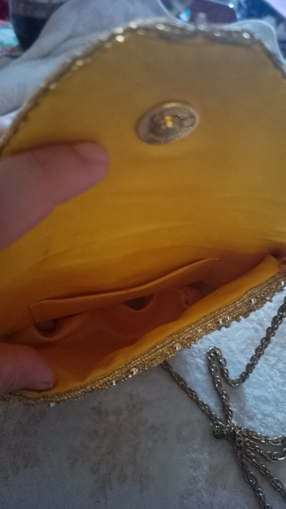 This is a beautiful gold beaded evening clutch. Perfect for a special occasion or a night out. It has a chain strap and a magnetic snap closure. The inside is lined with a yellow fabric and has a small pocket