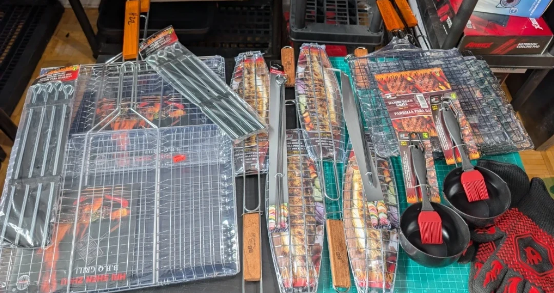 Got a variety of BBQ grill tools and accessories for sale! Includes spatulas, tongs, grill brushes, over mitts and matching kitchen towels, an assortment of vegetable, meat and fish grilling baskets, BBQ skewers/kebab/roasting sticks (100s), grilling gloves and much more!