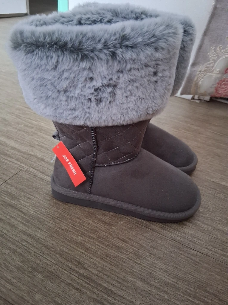 Cozy Joe Fresh winter boots in a lovely grey colour! The size is 13. These boots feature a soft, faux-fur trim and a quilted design on the shaft. Originally bought for $34!