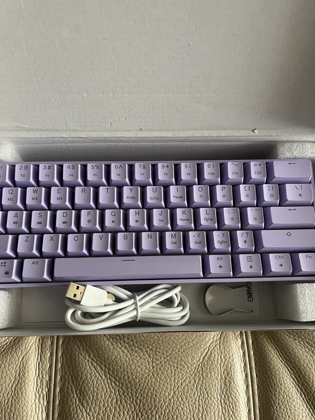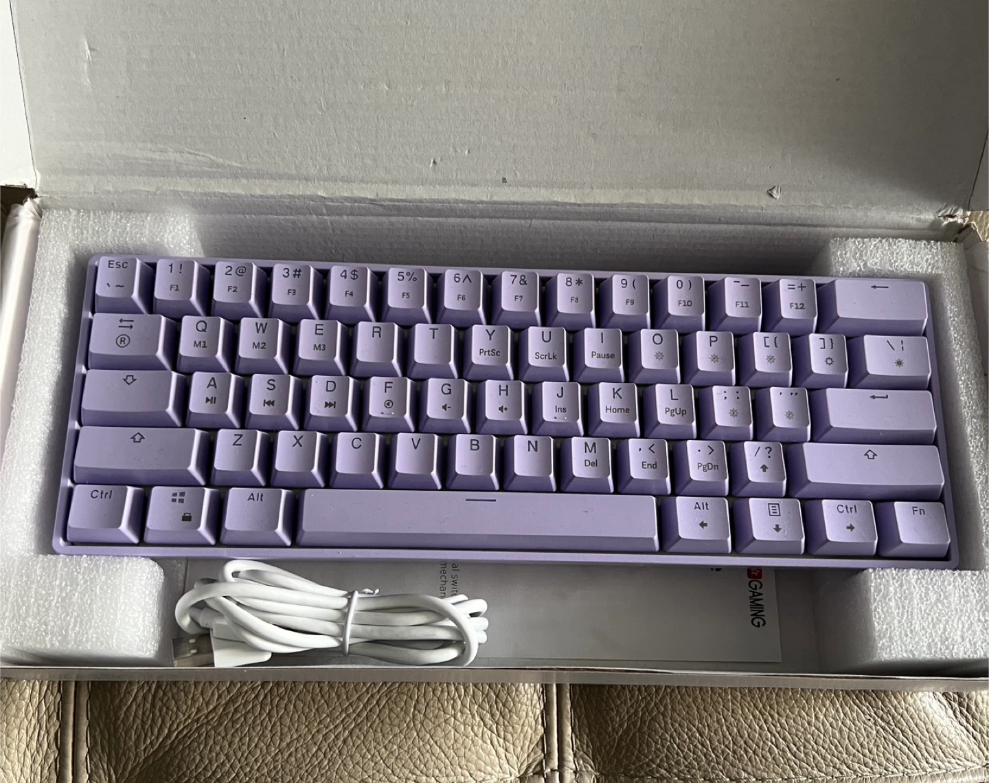 Selling a HK Gaming GK61 60% optical gaming keyboard in a lovely lilac colour! It features optical switches and doubleshot injection keycaps. The keyboard also has RGB lighting with 16.8 million colours and a polling rate of 1000 Hz (1 ms). Comes with a detachable USB Type-C cable and the original box. Used only a few times. Was gifted a different one and decided to sell this one.