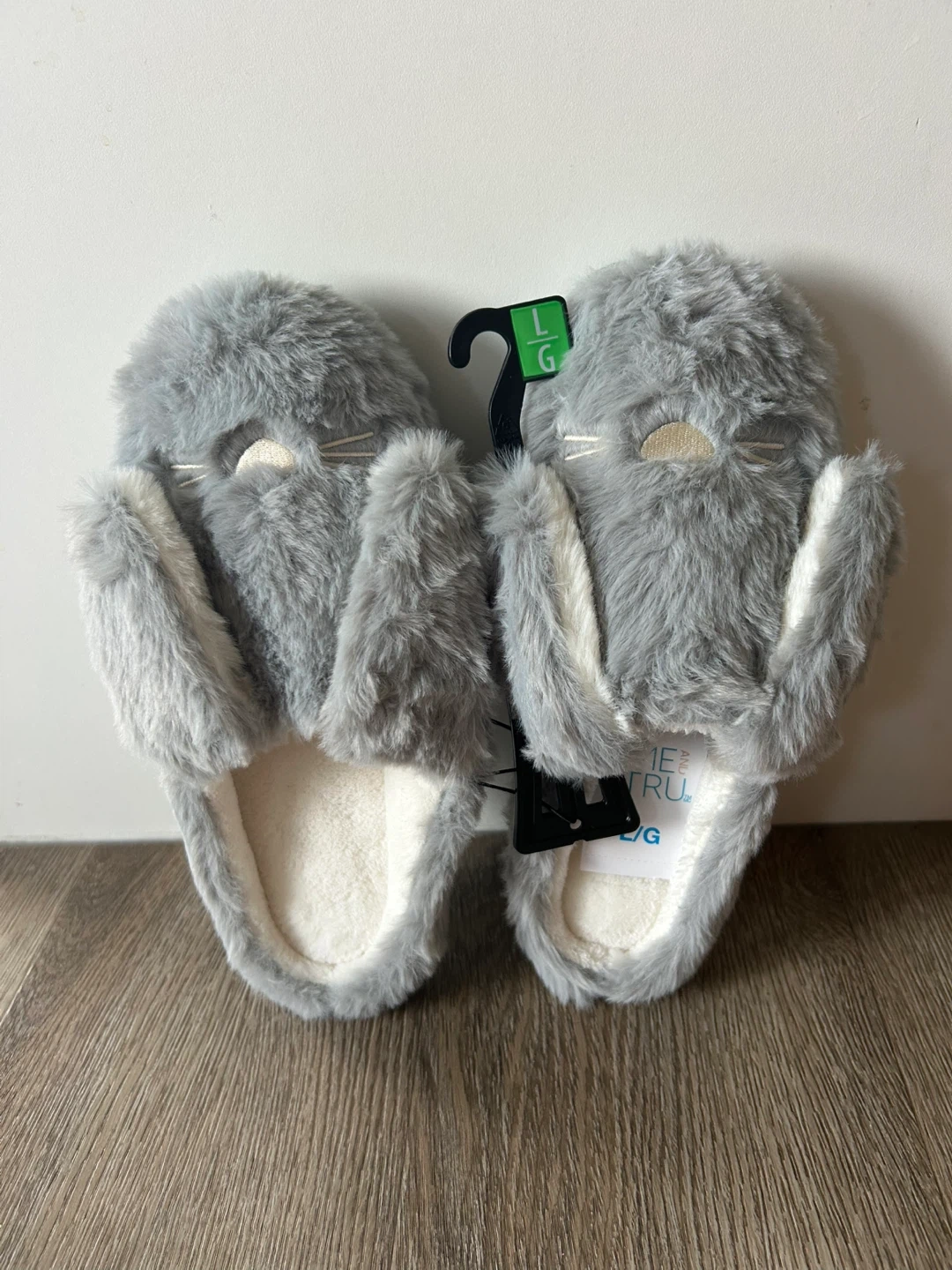 Super cute and cozy bunny slippers in a size large! They are grey and fuzzy, perfect for keeping your feet warm on chilly days.