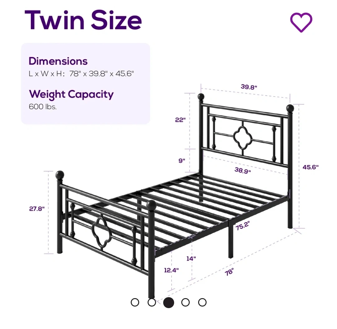 Looking to upgrade your bedroom? I'm selling a black metal twin bed frame. It's in great shape and ready for a new home! The dimensions are approximately 78" x 39.8" x 45.6". It can support up to 600 lbs