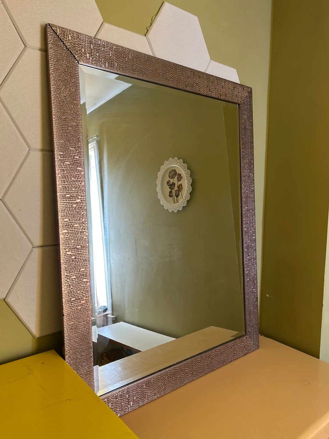 Selling a large mirror with a unique textured frame! It's in good condition and would be a lovely addition to any room. It’s 34x44 inches. Message me for details. Pickup is near Bathurst station.