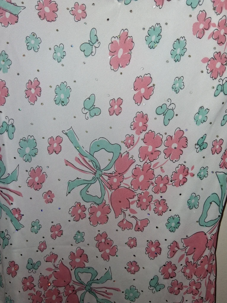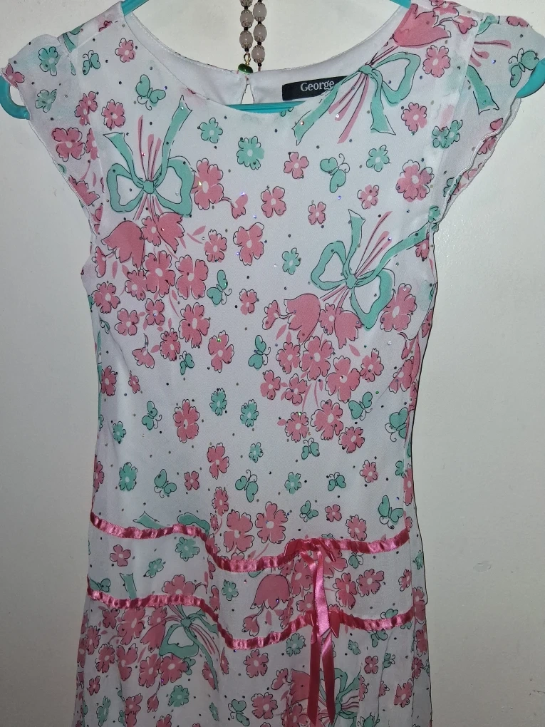 This adorable George dress is perfect for your little one! It features a cute floral and ribbon pattern in pink and teal. It's in great condition and ready for a new home!