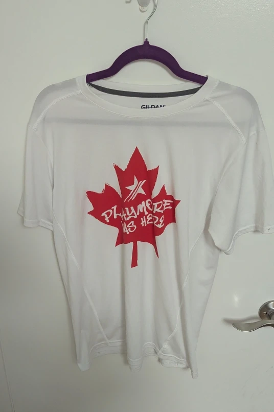 Selling a Gildan Performance t-shirt in size medium. It's white with a red maple leaf design. Made from 100% polyester, it's perfect for workouts or casual wear!