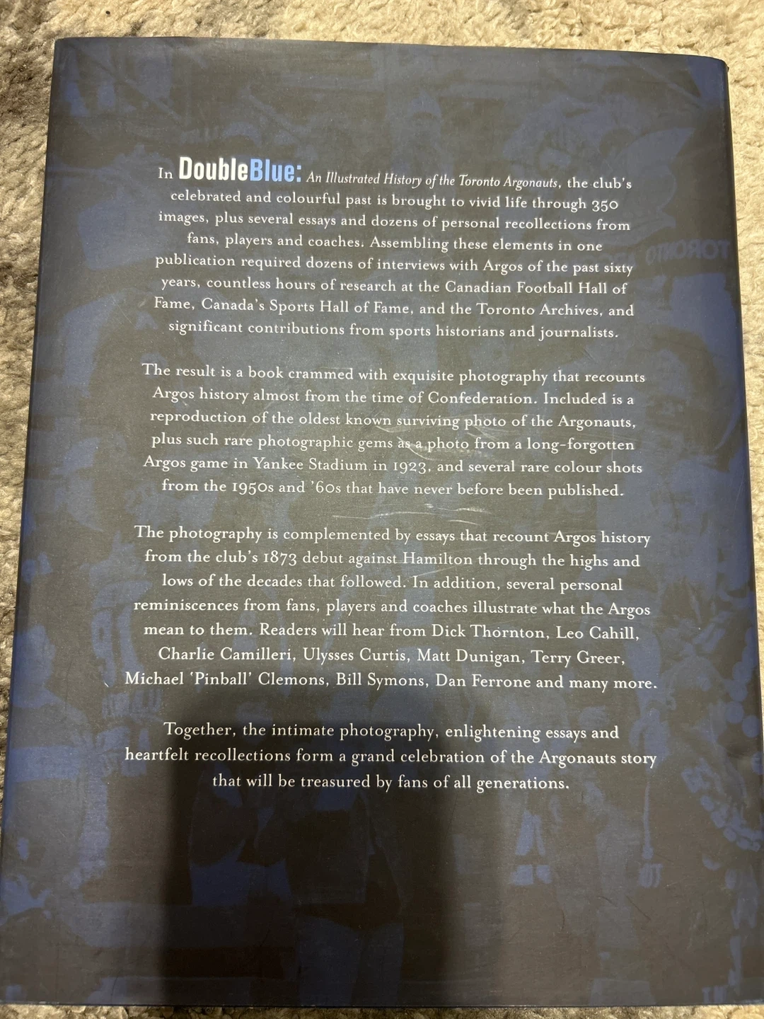 Selling "Double Blue: An Illustrated History of the Toronto Argonauts" edited by Jim O'Leary and Wayne Parrish. This book is a celebration of the Toronto Argonauts, filled with vivid images and personal recollections from fans, players, and coaches. It recounts Argos history and includes rare photographs from the team's past. A great read for any Argos fan!