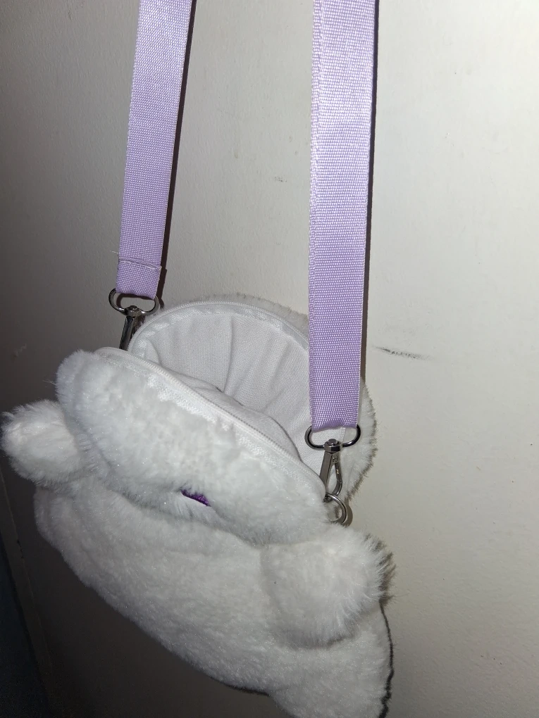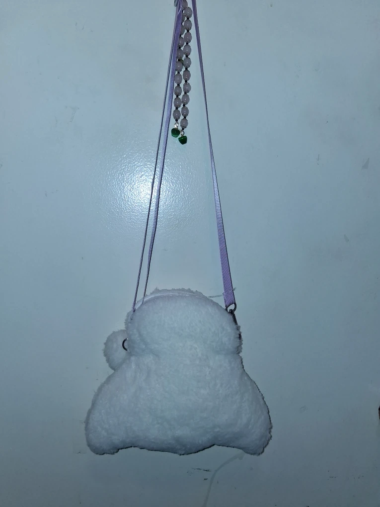 Super cute ghost plush shoulder bag! It's got a soft, fluffy texture and a light purple strap. Perfect for adding a fun touch to any outfit. The strap is adjustable!