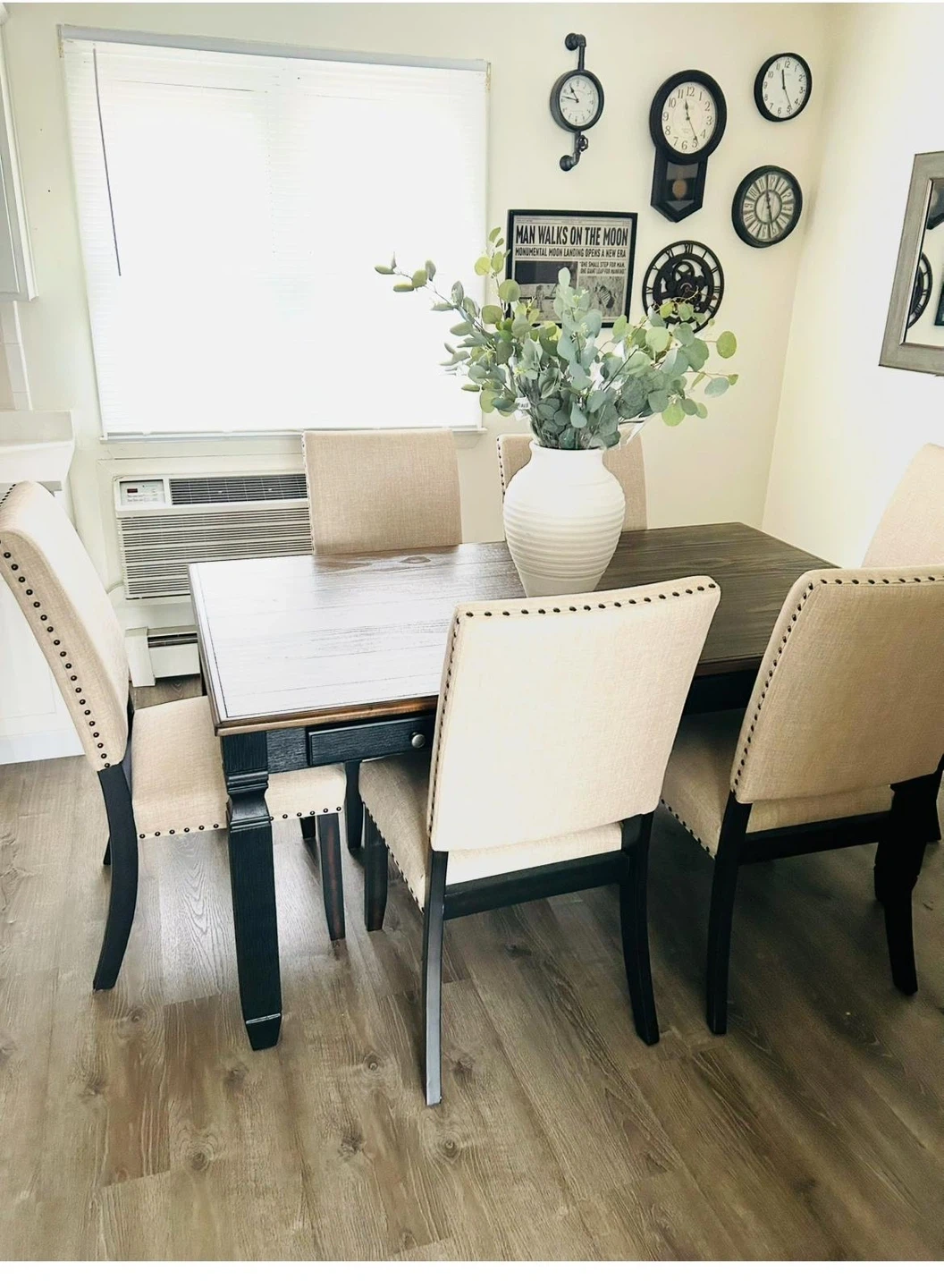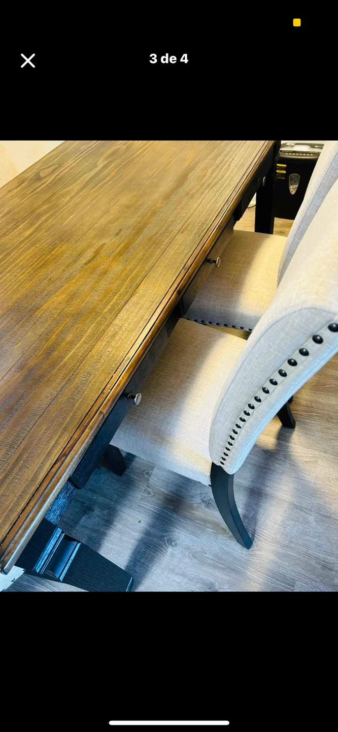 Selling a dining table with 6 chairs. The chairs are upholstered with a light beige fabric and have decorative nailhead trim. The table has a dark wood top and a light-colored base with drawers. It's a stylish set that would look great in any dining room!