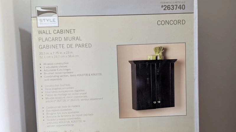 Selling 2 brand new Concord wall cabinet still in its original box! It features all-wood construction, two adjustable shelves, and adjustable Euro hinges. The hardware has a brushed nickel finish. Dimensions are 20.5 in x 7.75 in x 23 in