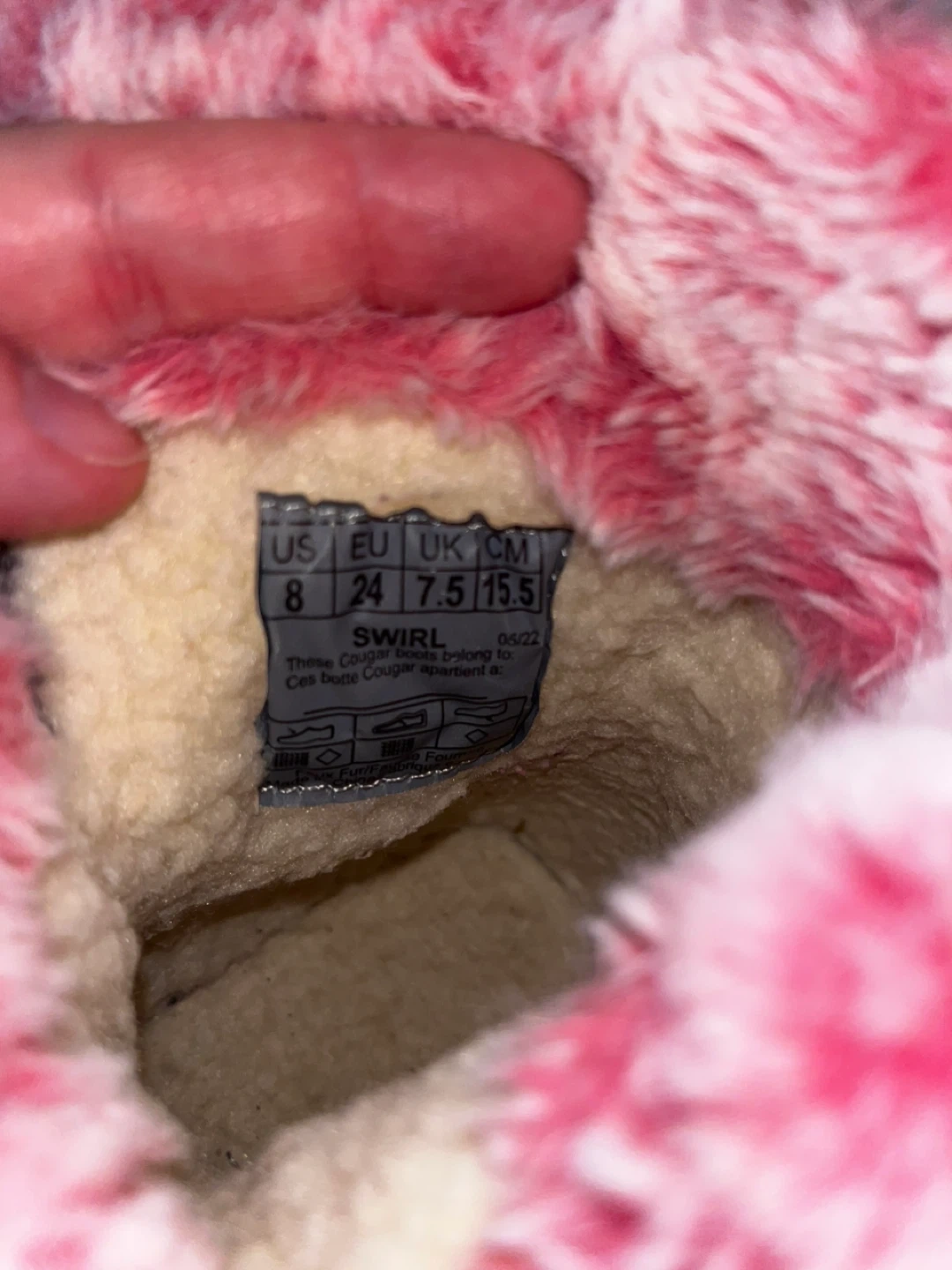 Keep your little one warm and stylish with these Cougar Swirl winter boots! They're a size 8 (US) and feature a cute, colourful design with a pink faux-fur trim. These boots are waterproof, perfect for snowy days
