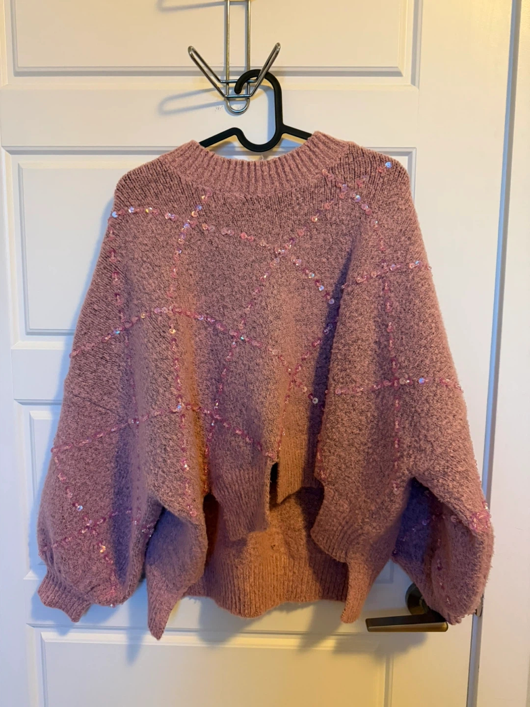 Selling a cute pink sweater with sparkly details! It's a size small and has a cozy, oversized fit. Perfect for adding a bit of sparkle to your wardrobe!
