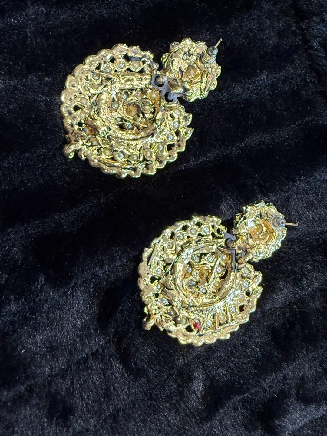 These are a pair of gold-tone dangle earrings. They feature faux pearls, red and green beads, and a central clear stone. They are in good condition and ready to wear!