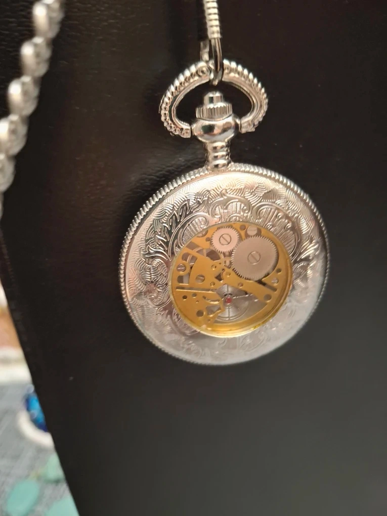 Selling a vintage-style silver pocket watch necklace. It features a unique skeletal design, allowing you to see the inner workings of the watch. The watch face has Roman numerals, adding to its classic charm. The chain is a matching silver colour, complementing the watch perfectly