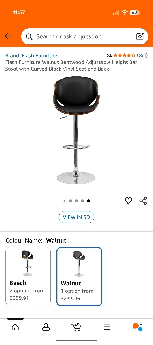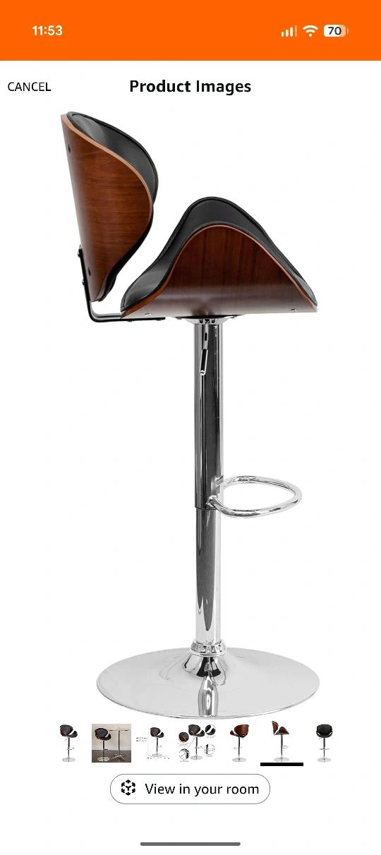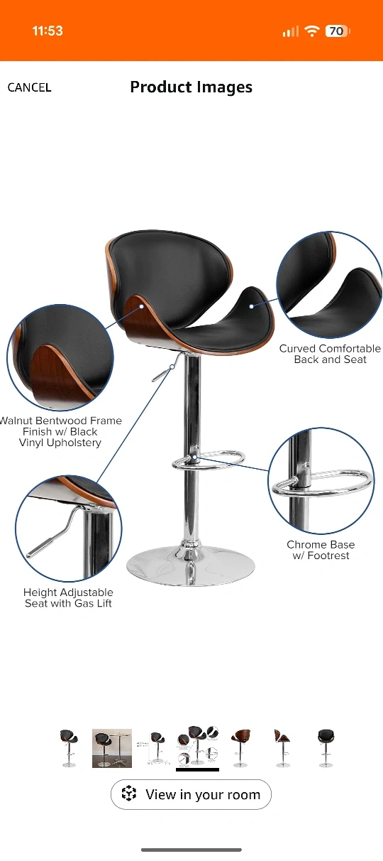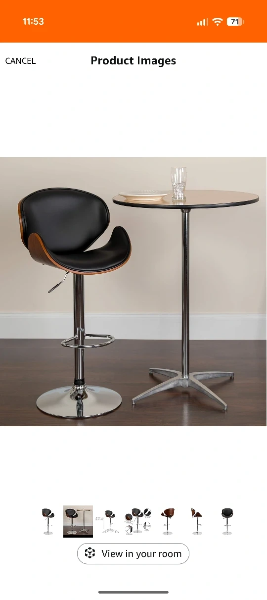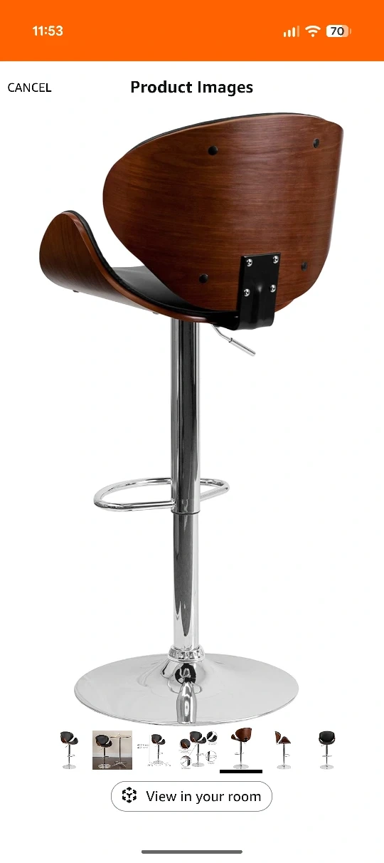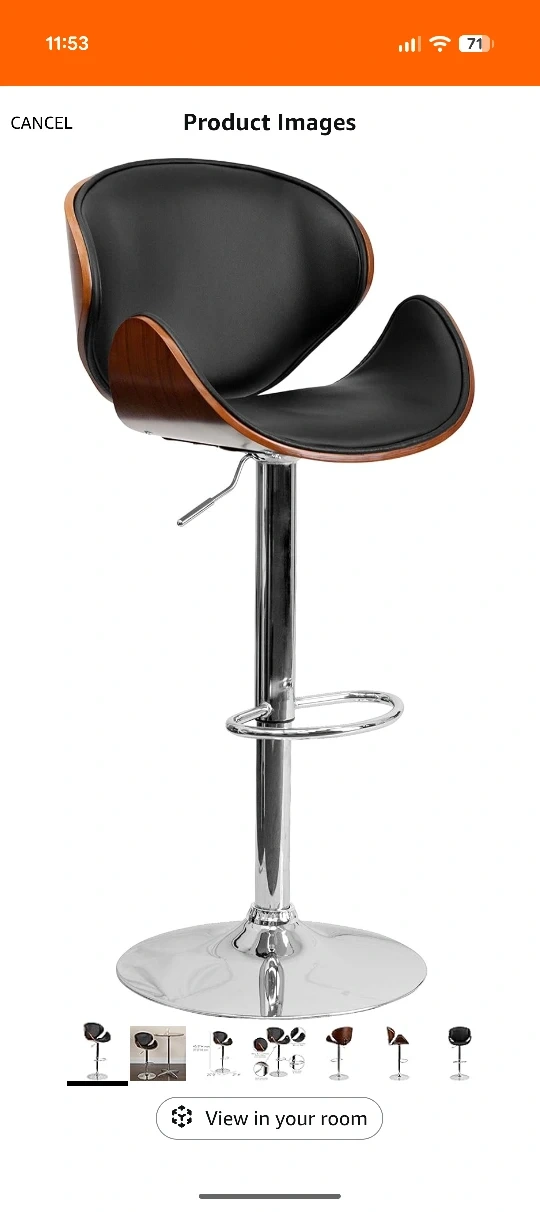 Here's a stylish bar stool with a walnut bentwood frame and black vinyl upholstery