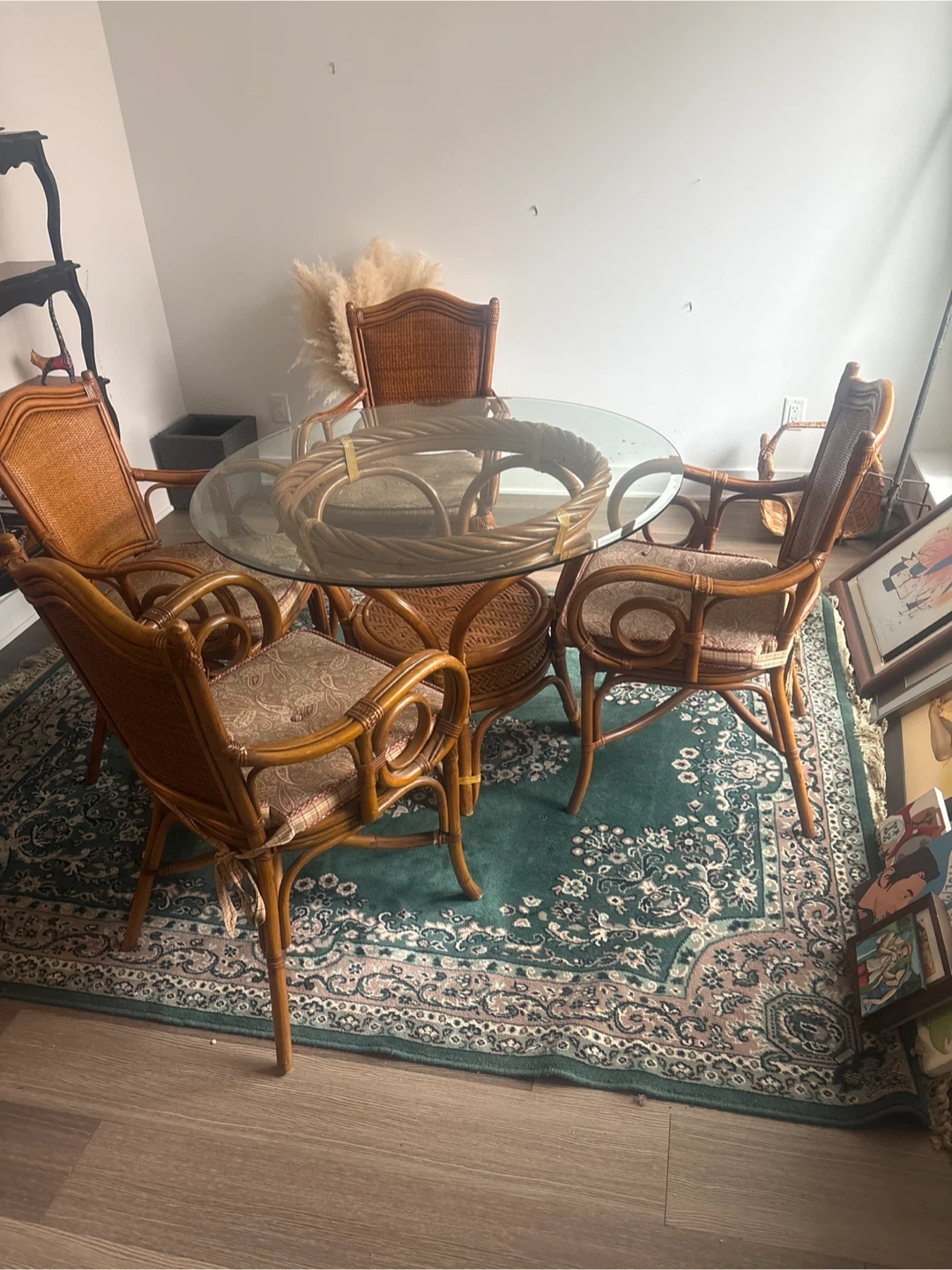 Selling a charming wicker dining set! It includes a round glass-top table and four matching chairs. The chairs have patterned cushions for added comfort. Perfect for a sunroom or cozy dining area!