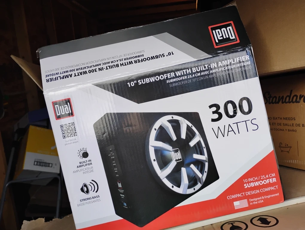 Selling a Dual 10" subwoofer with a built-in amplifier. The box indicates it delivers 300 watts and has strong bass. It's a compact design engineered in the USA. Perfect for adding some extra thump to your car's audio system