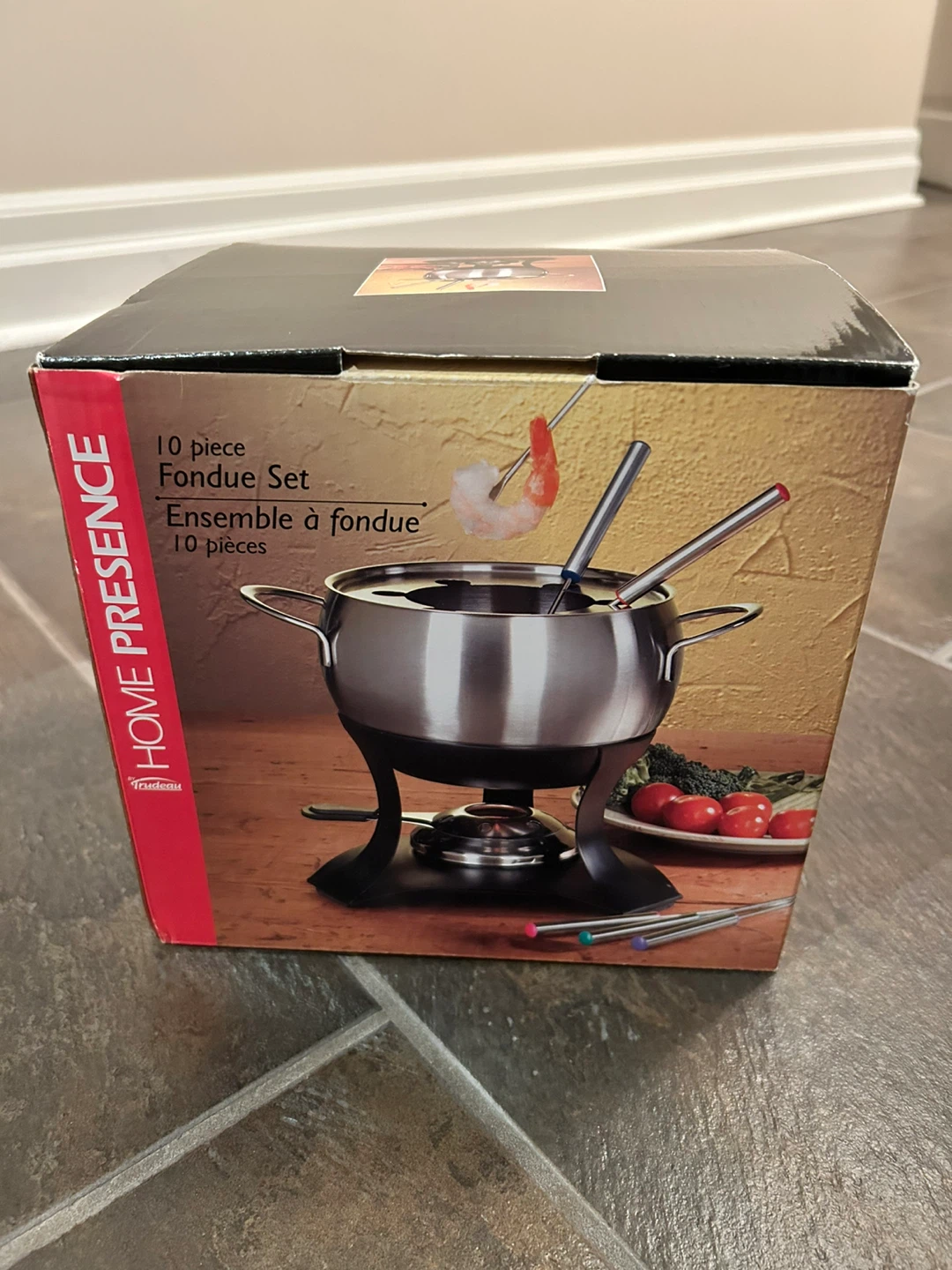 Selling a brand new Trudeau 10-piece fondue set! It's still in its original box and ready for your next gathering. This set includes everything you need for a fun and delicious fondue experience. Perfect for cheese, chocolate, or meat fondue!