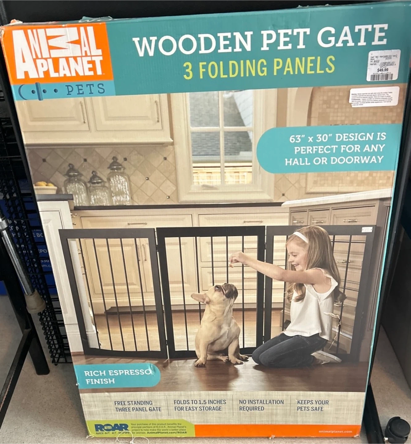 Selling an Animal Planet wooden pet gate. It has a rich espresso finish and features a 3-panel design that folds for easy storage. It's free-standing, so no installation is required! The gate is 63" x 30", making it perfect for any hall or doorway.