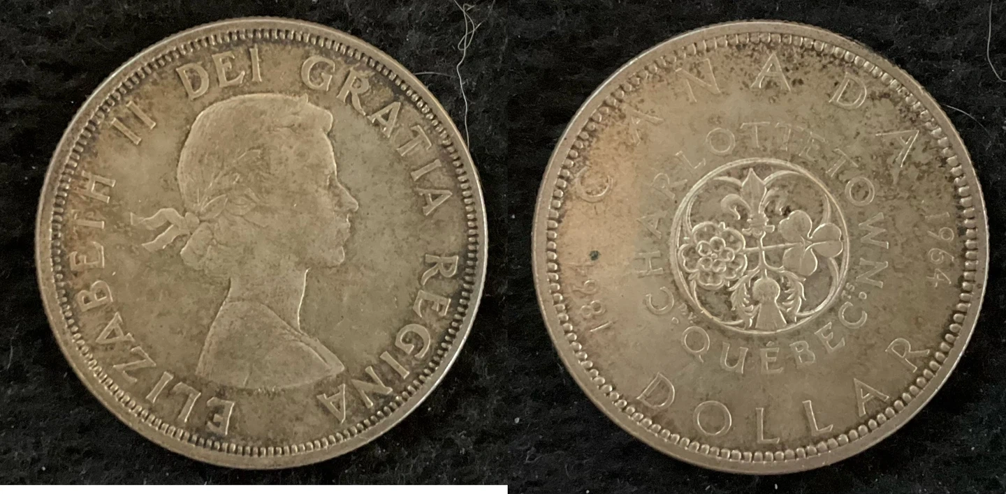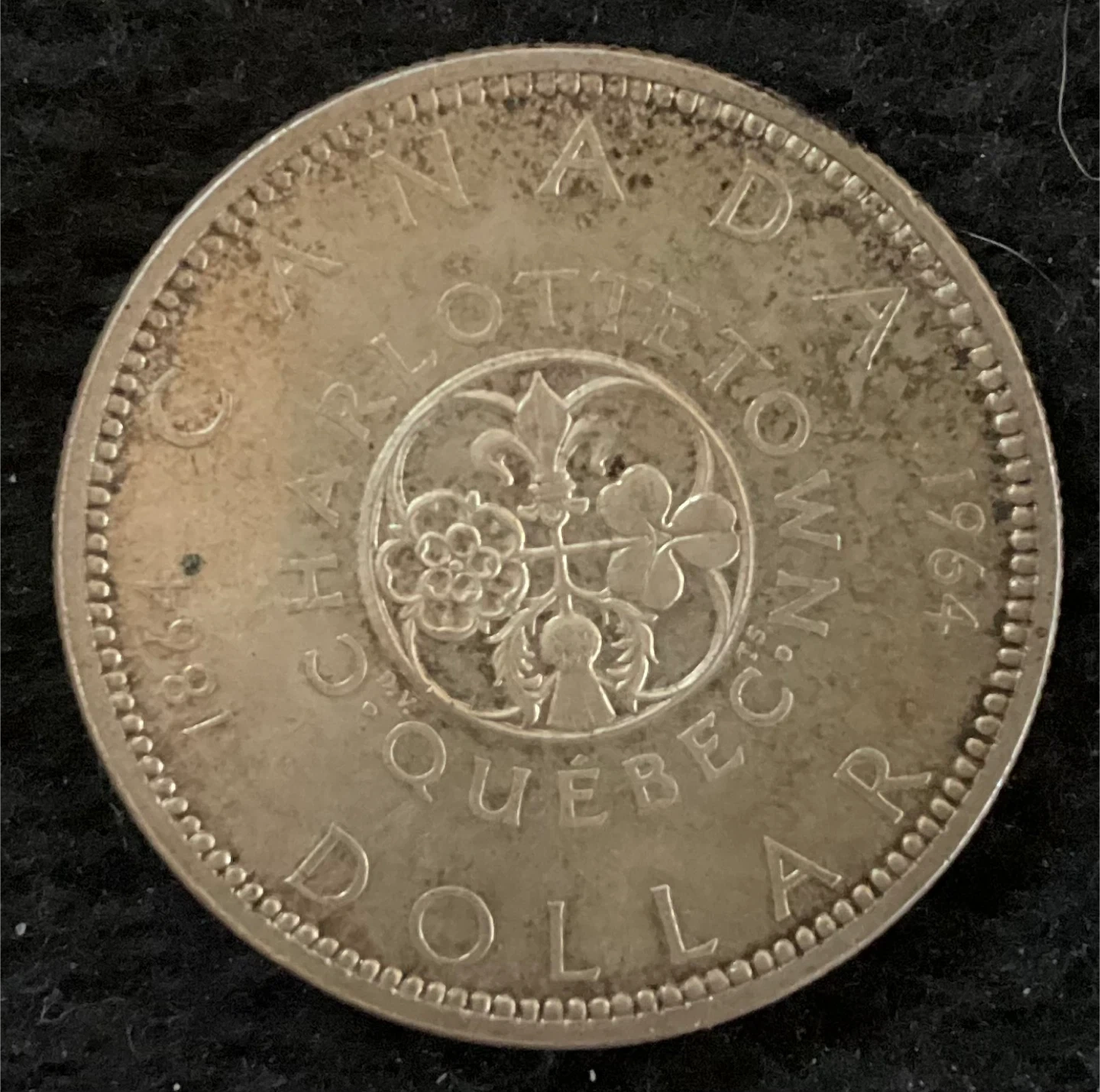 Selling a 1964 Canadian silver dollar. The coin commemorates the 100th anniversary of the Charlottetown & Quebec Conferences of 1864. Consists of 80% silver.