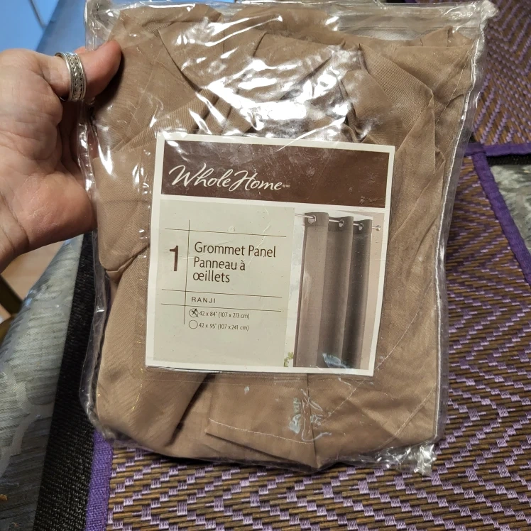 Selling a new set of Whole Home grommet panel curtains in the RANJI style! They are 42 x 84 inches (107 x 213 cm) and come in their original packaging. The fabric content is 100% polyester, making them durable and easy to care for