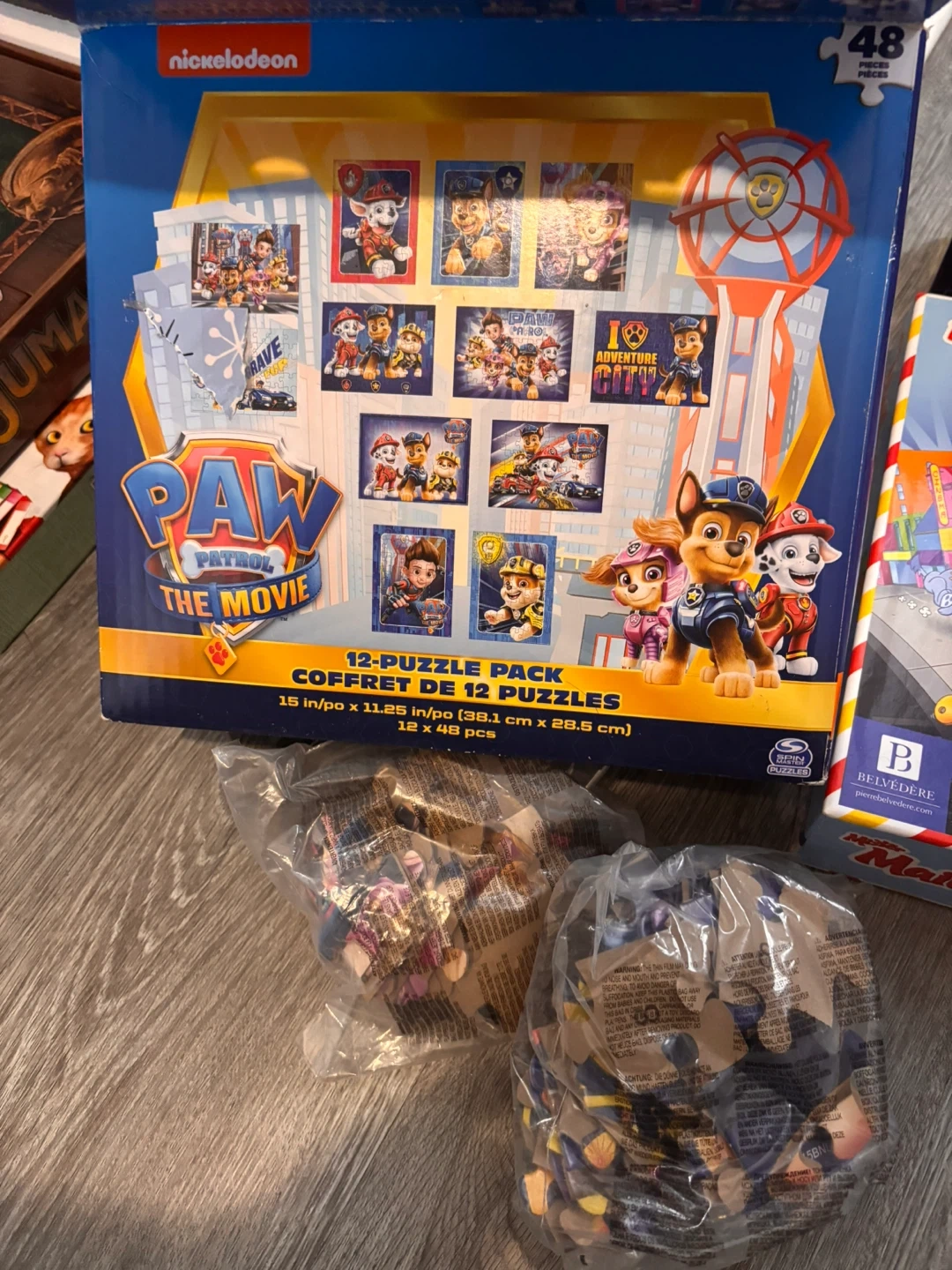 Paw Patrol The Movie 12-Puzzle Pack from Nickelodeon! It contains 12 puzzles in one box. Each puzzle is 15 in/po x 11.25 in/po (38.1 cm x 28.6 cm) and has 48 pieces and many other games and puzzles