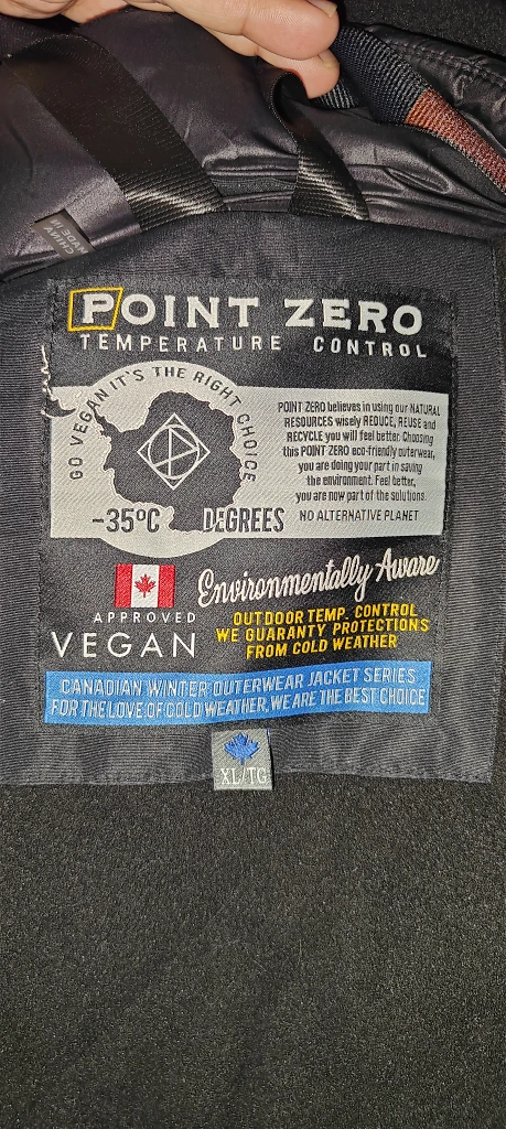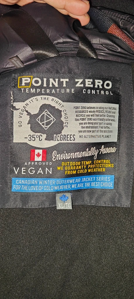 Point Zero Temperature Control winter jacket in size XL/TG. It's a vegan jacket designed for cold weather, offering outdoor temperature control and protections from cold weather. It's in great condition and ready for the Canadian winter!