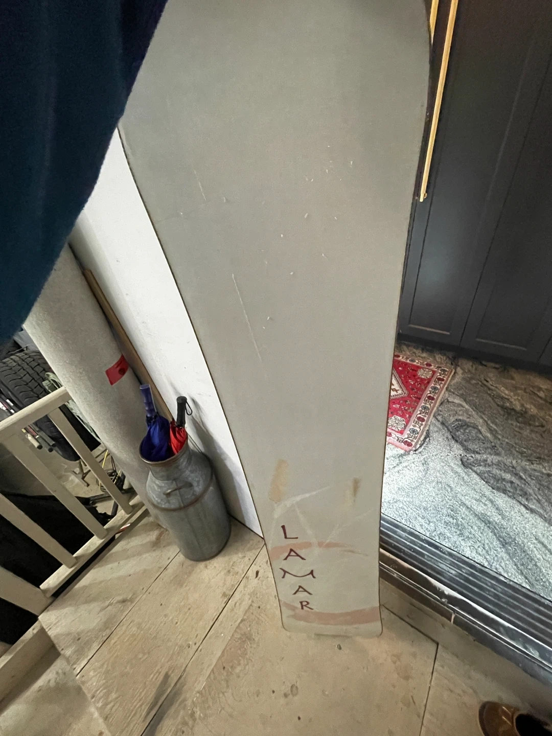 Selling a Lamar snowboard. It has a unique design on the top, featuring a tree-like illustration. The board shows some signs of wear, but is still in good condition for hitting the slopes this winter