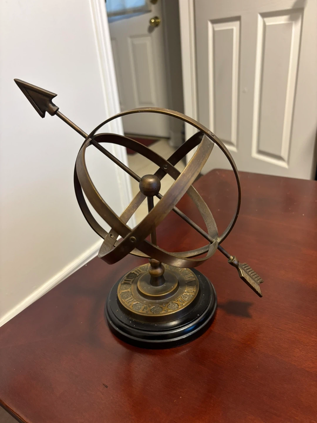 Selling a vintage armillary sphere decor piece! It's a unique and eye-catching item that would look great in any room. It has a classic design with an arrow through the sphere. It's in great condition and ready to find a new home! Purchased 30 years ago from the Bombay Company.