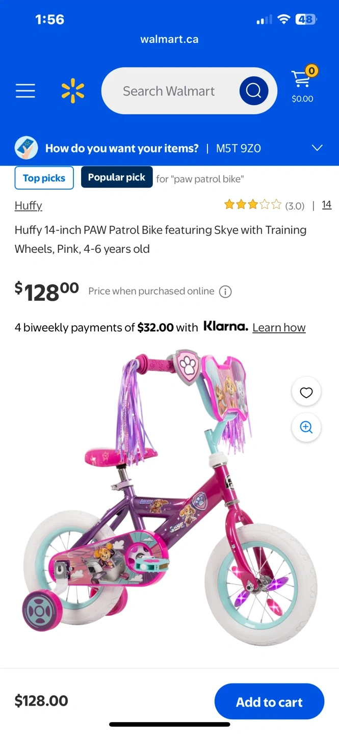 Selling a used Paw Patrol girls' bike. It has 14 inch wheels and is purple and pink. It shows some signs of wear and tear.