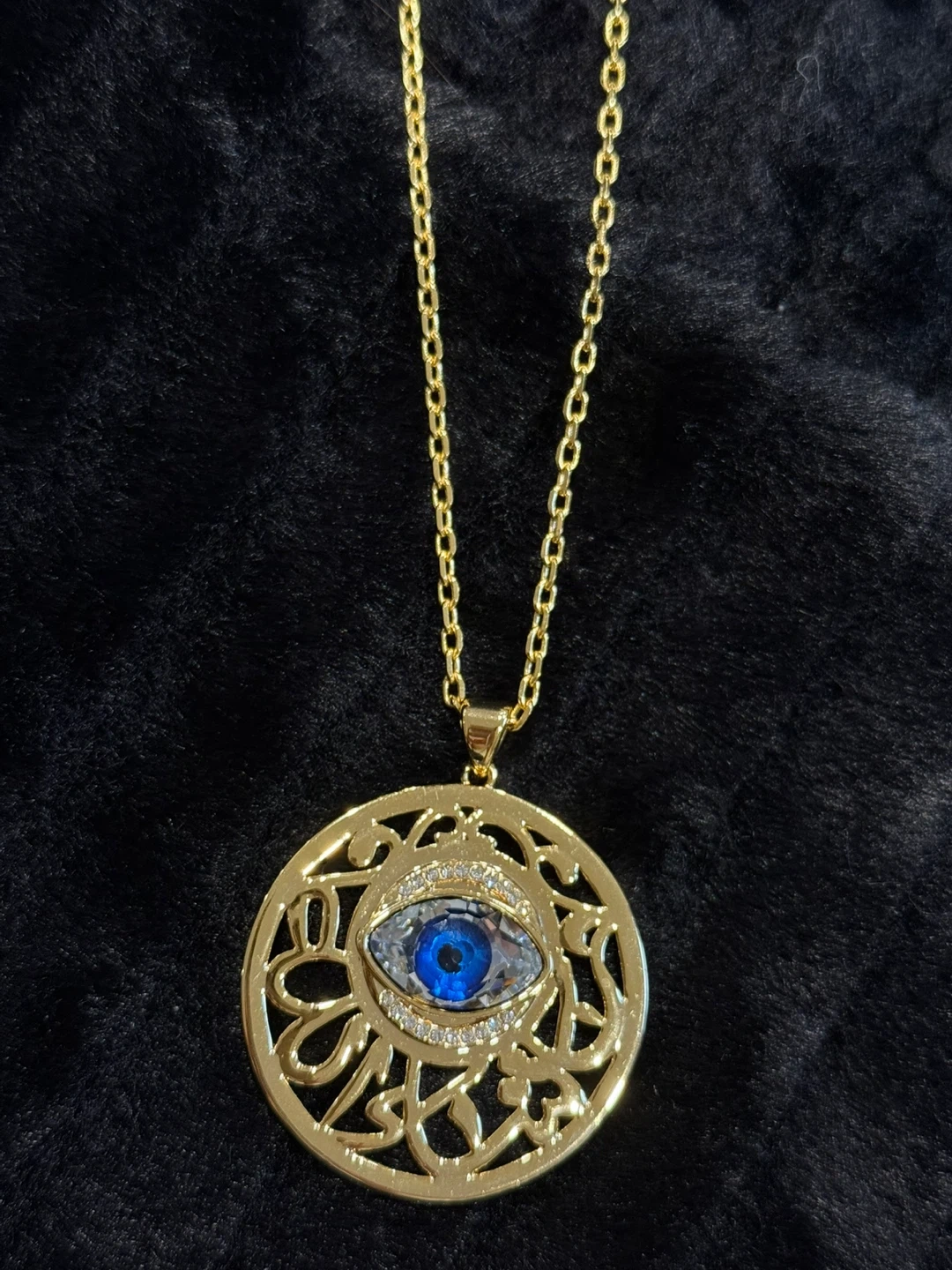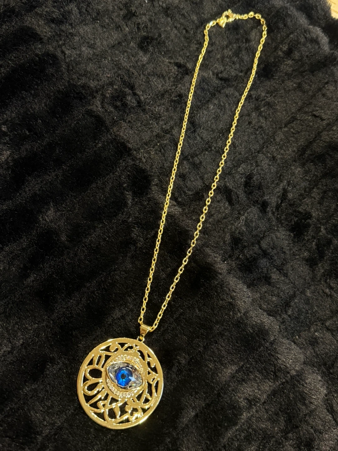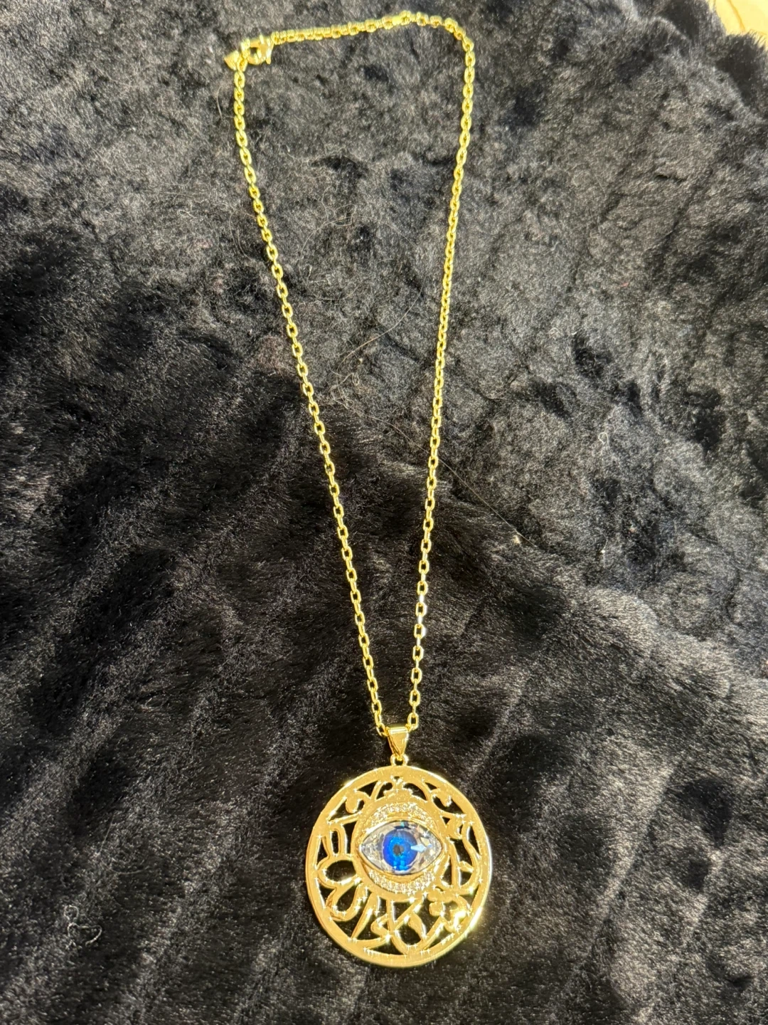 Selling a beautiful gold-plated necklace featuring an evil eye pendant with a blue centre stone and clear accents. It's in great condition and ready to wear!