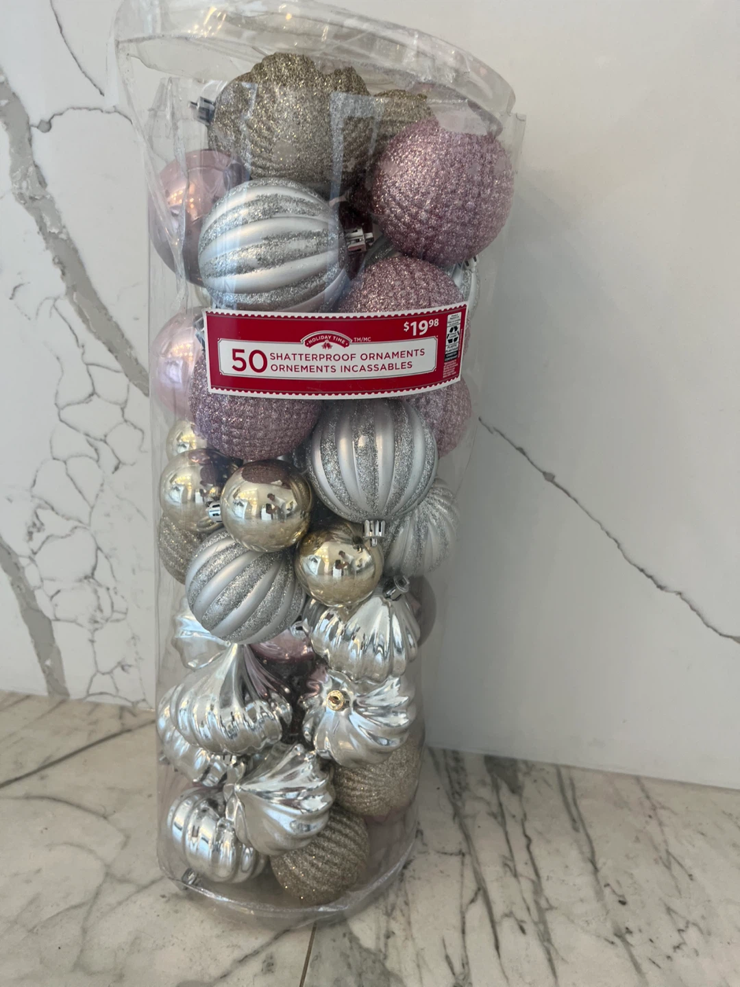 Selling a set of 50 shatterproof ornaments from Holiday Time! These ornaments come in a mix of silver, gold, and pink tones, perfect for adding a touch of sparkle to your holiday decor. The original price was $19.98.