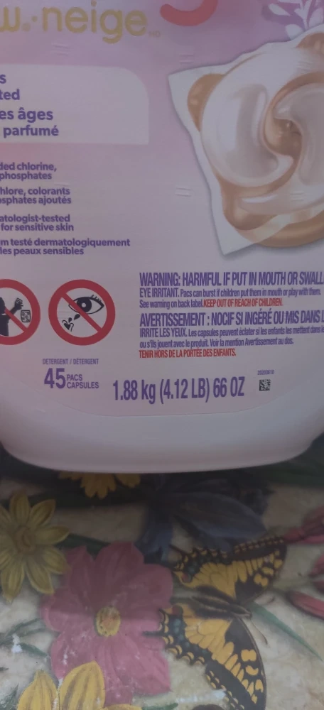 Ivory Snow laundry detergent pods, lightly scented and suitable for all ages! This container has 45 pods and weighs 1.88 kg (4.12 lb/66 oz). Gentle enough for baby and strong enough for the whole family! Great for sensitive skin