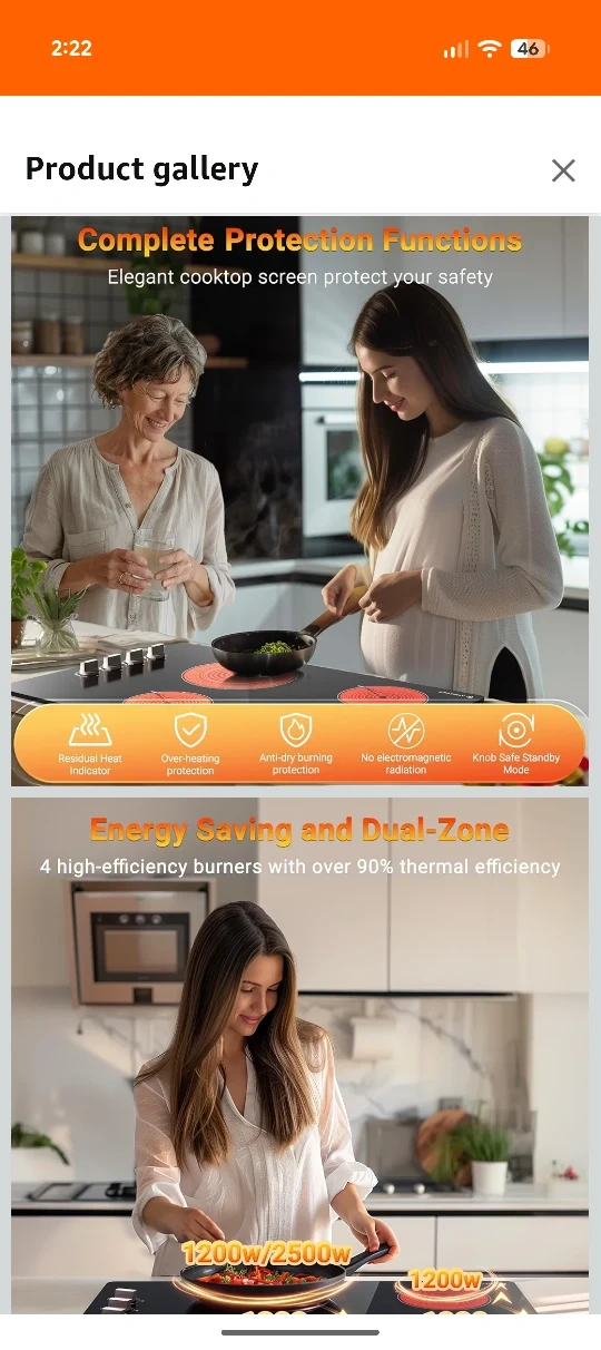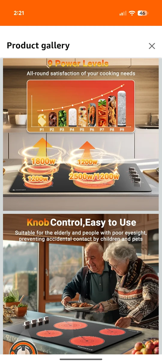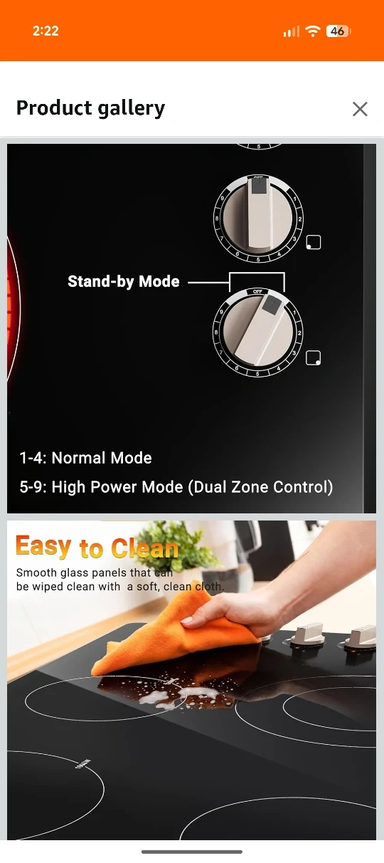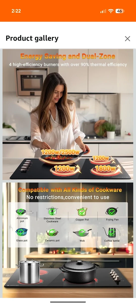 Selling an AMZCHEF 4 burner electric cooktop. It features smooth glass panels that are easy to clean, and has 9 power levels for all your cooking needs. It's compatible with all kinds of cookware and has energy saving and dual-zone functionality.