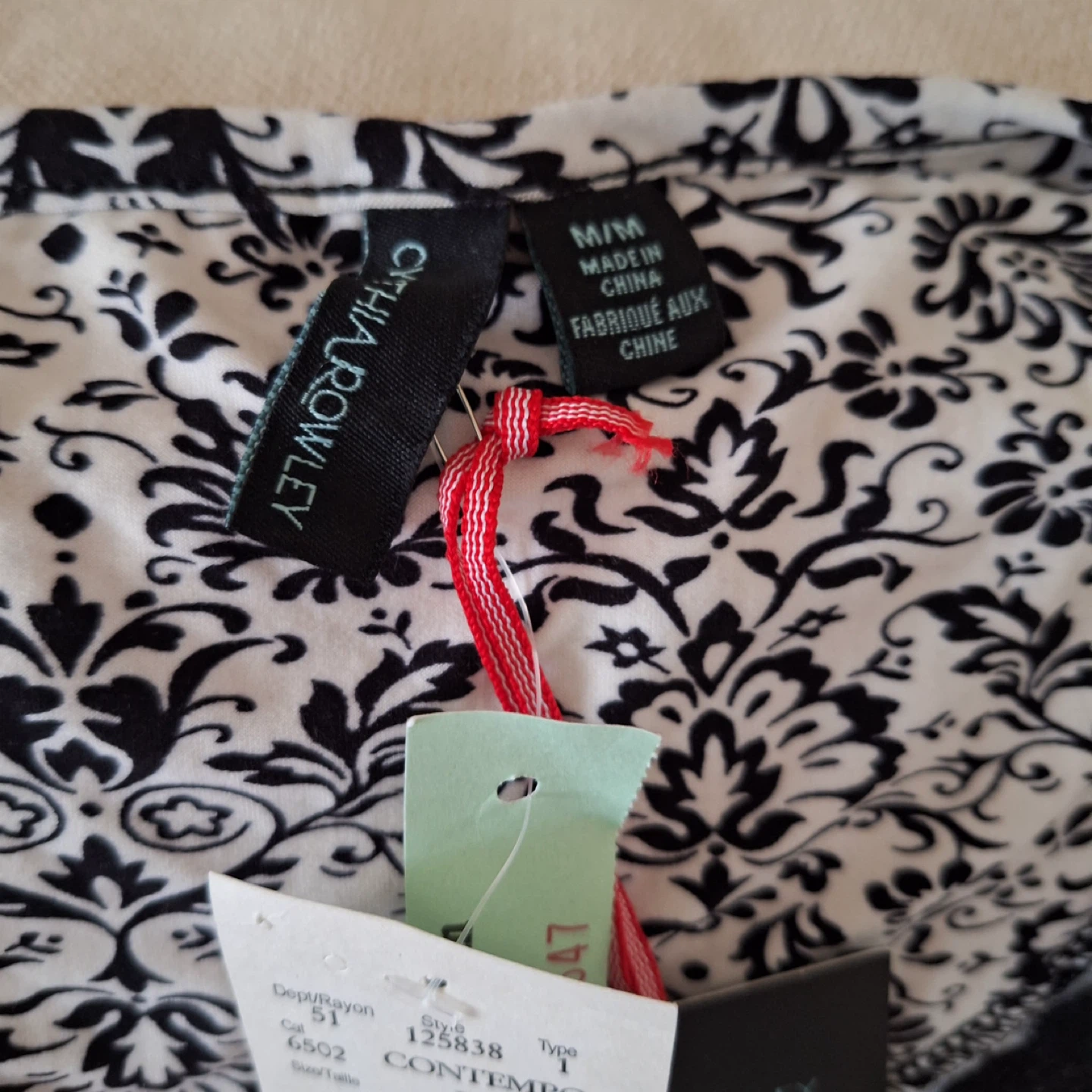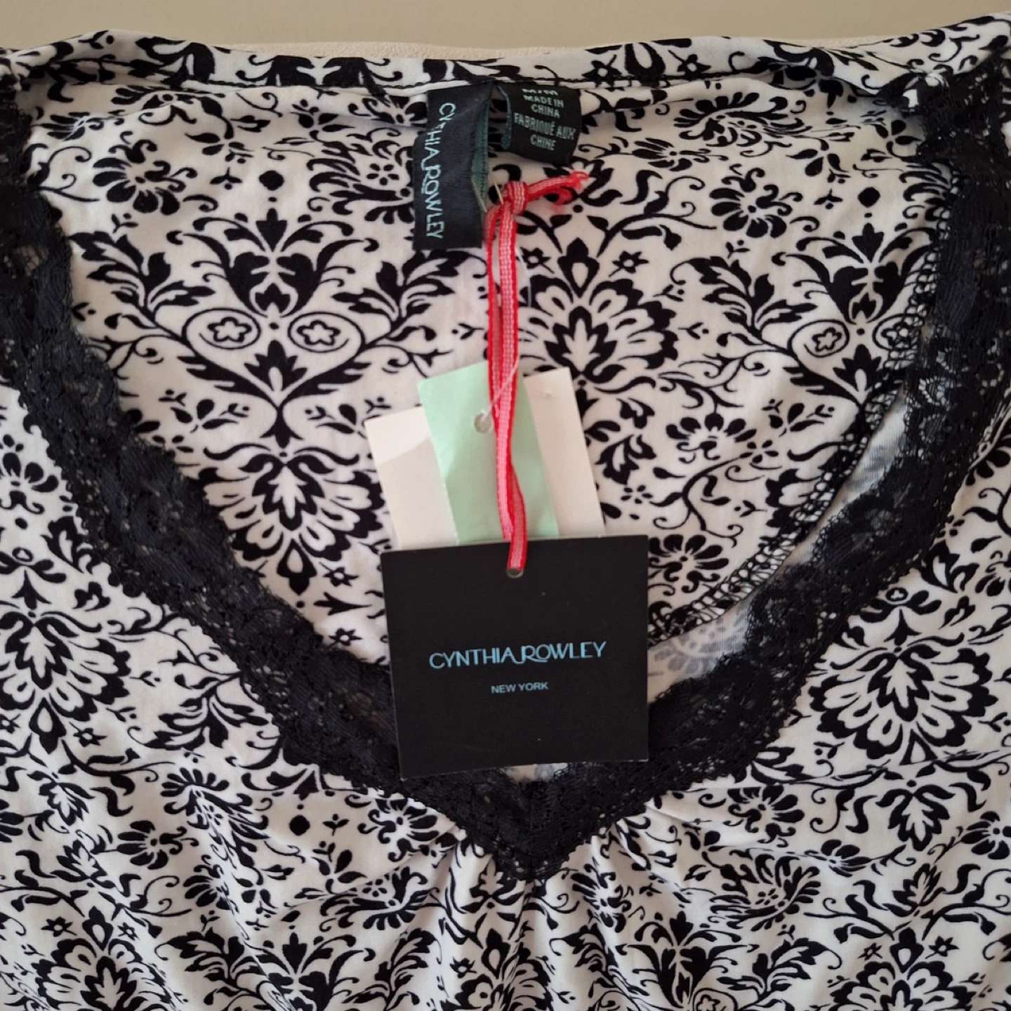 This is a brand new Cynthia Rowley pajama set, still with tags attached! The set is a size medium and features a stylish black and white pattern. The tag shows 'Compare At/Comparable A $50.00' and Our Price/Notre Prix $24.99. 95% Polyester 5% Spandex