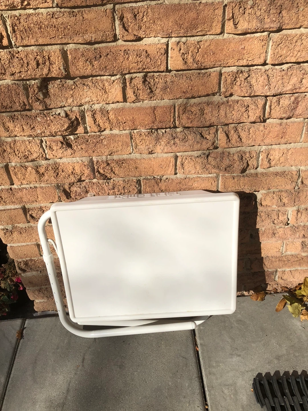 Selling a Table-Mate adjustable folding table. It's white and in good condition. Perfect for small spaces or as a portable workstation. All sales are final