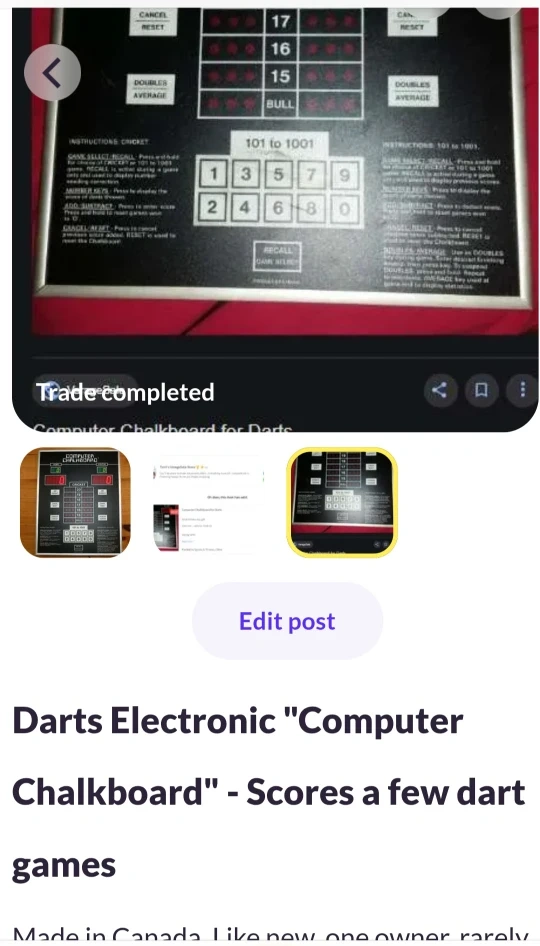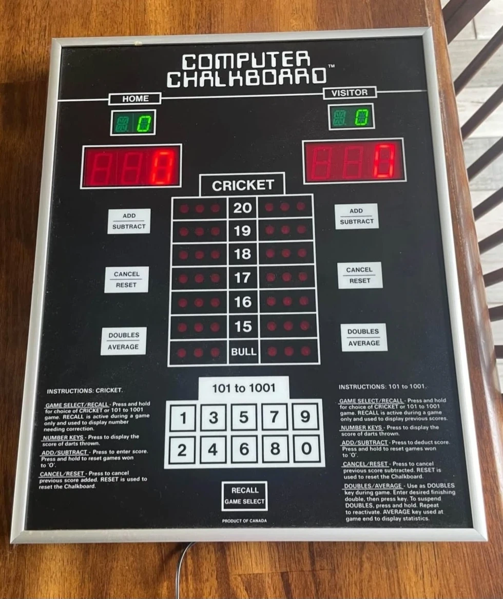 Computer Chalkboard scoreboard for darts. It is in like new condition and fully operational, with no scratches or dents. Made in Canada.