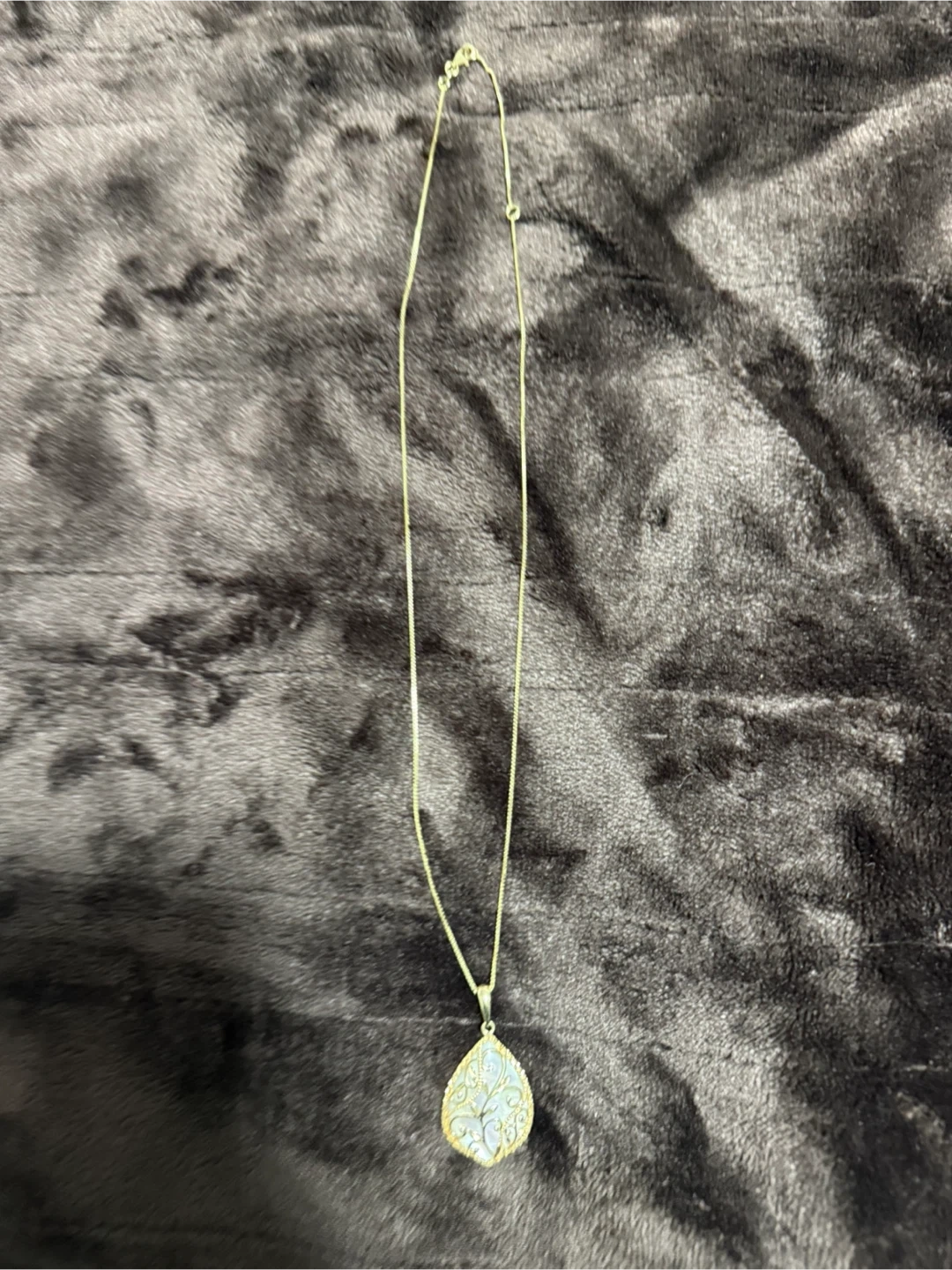 Selling a lovely gold-tone necklace featuring a teardrop-shaped pendant with a mother-of-pearl inlay. The pendant has a delicate floral design. It's in great condition and would make a beautiful addition to any outfit! 14 karat gold necklace.