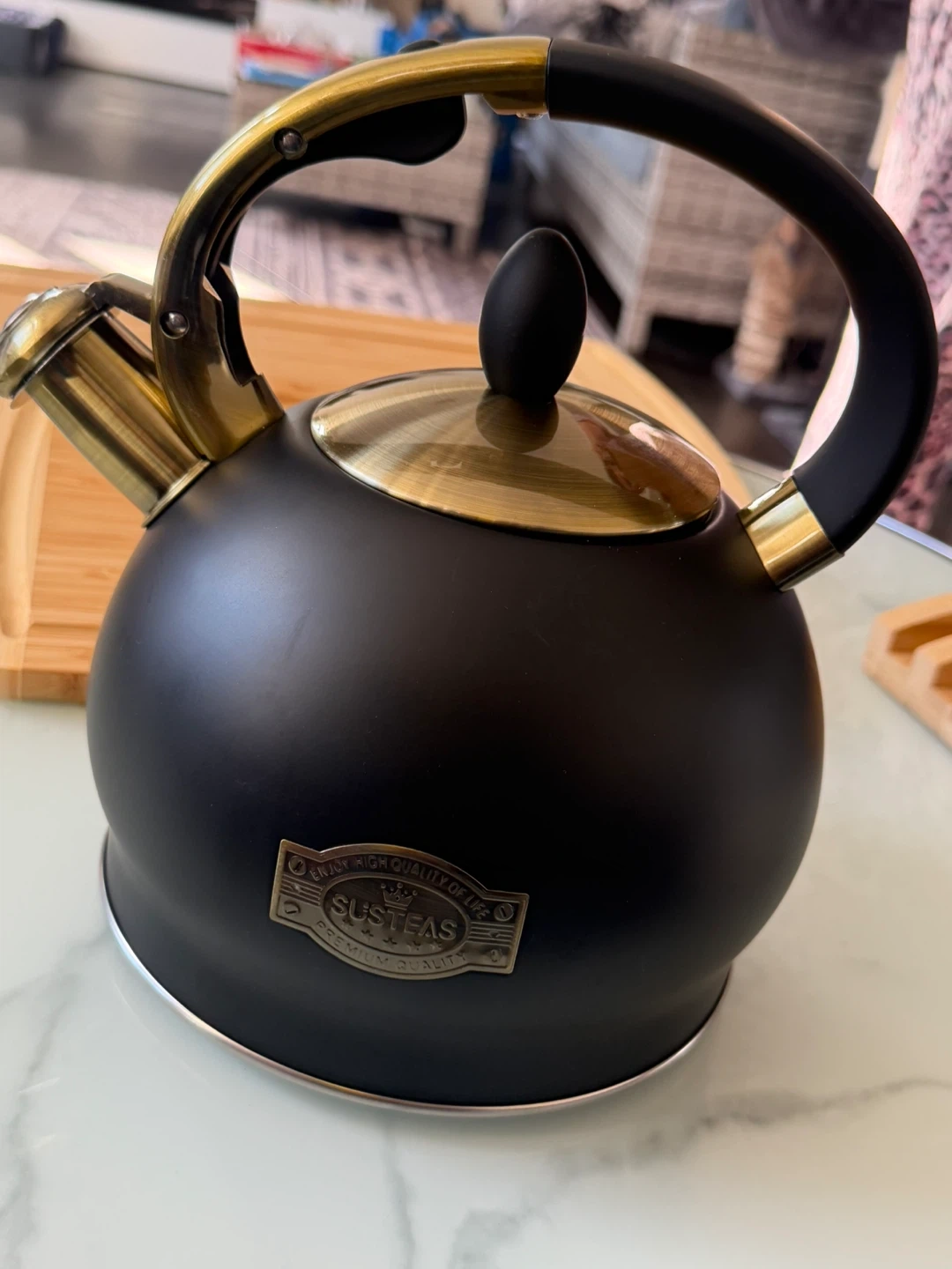 Here's a stylish black whistling kettle from Susteas! It's perfect for adding a touch of elegance to your kitchen while enjoying your favorite hot beverages.