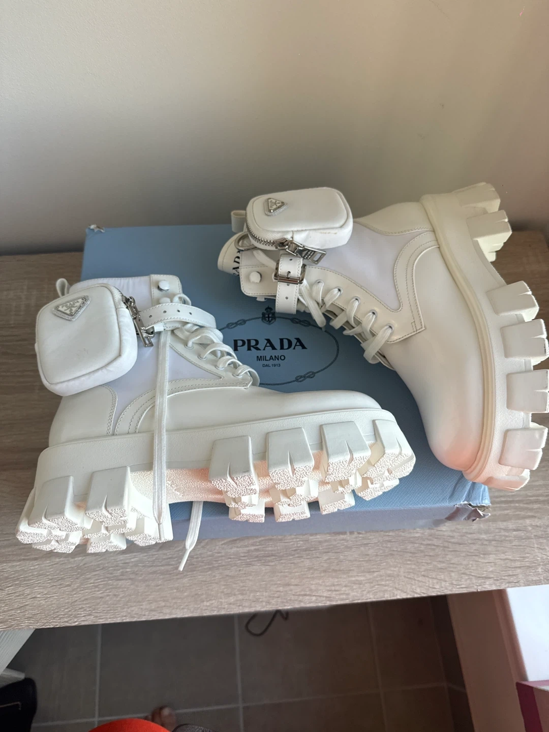 Selling a pair of Prada Monolith boots in white. These stylish boots feature a detachable pouch and a chunky lug sole. They come with the original box, so they're ready for a new home! Price matches authenticity.