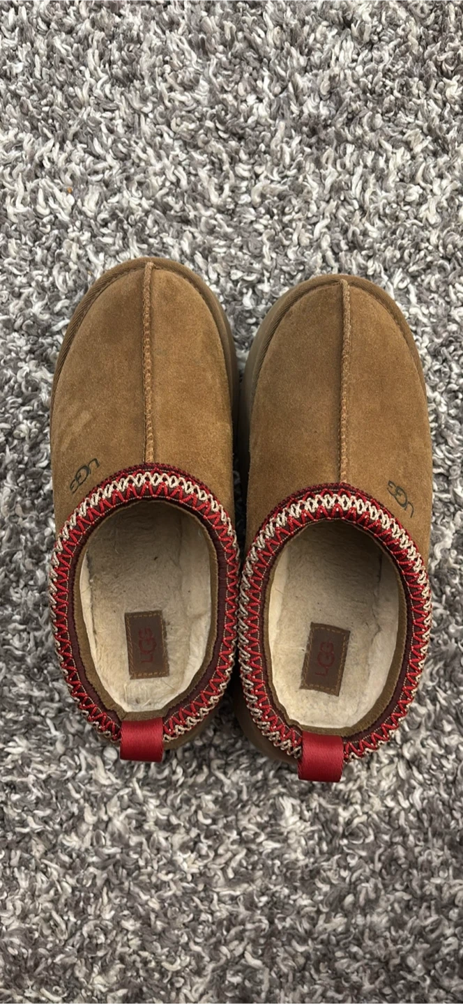 Selling a pair of UGG Tasman slippers in women's size 7. They are a cozy brown colour and show some signs of wear as pictured. Comes with the original box!