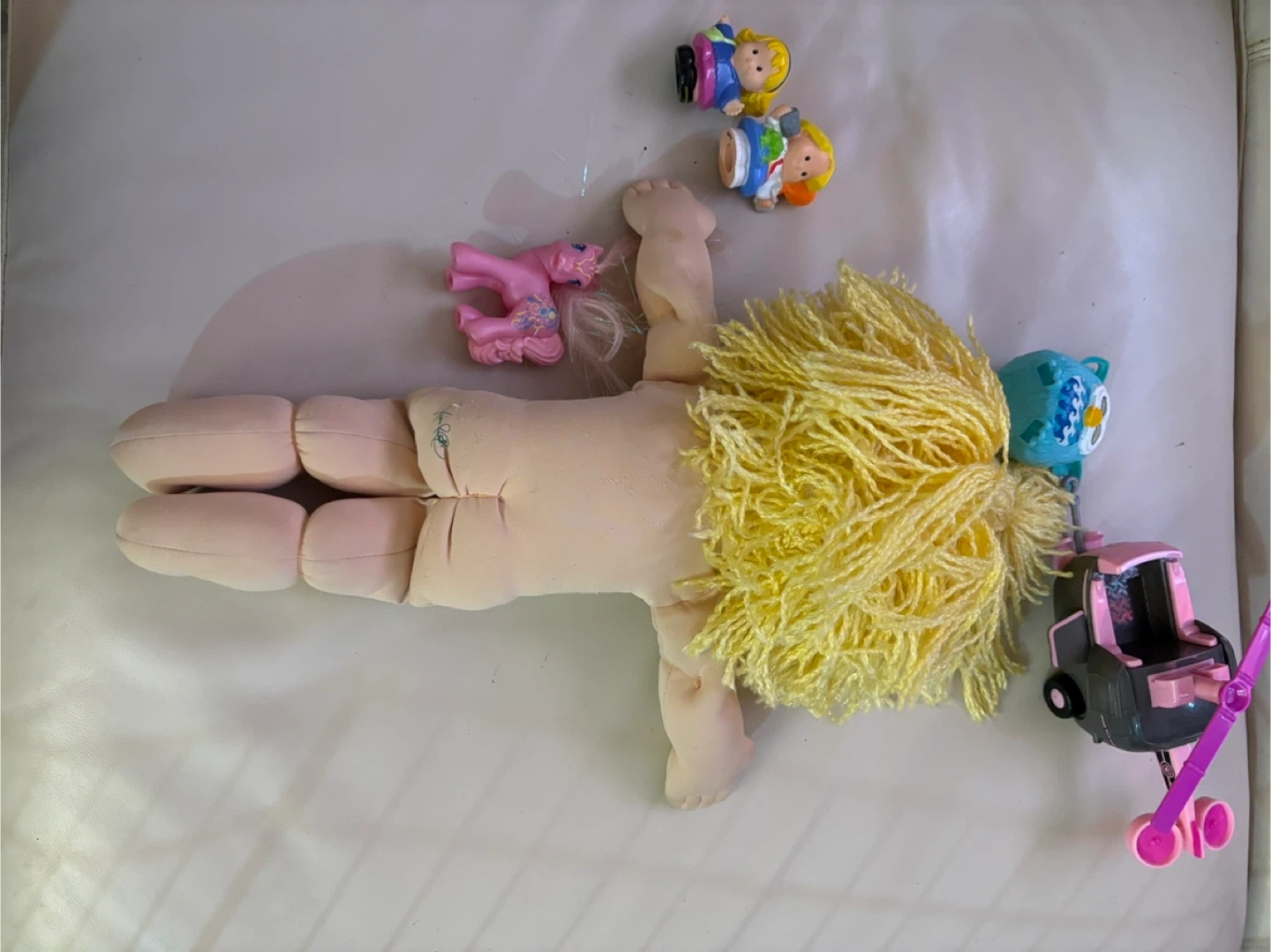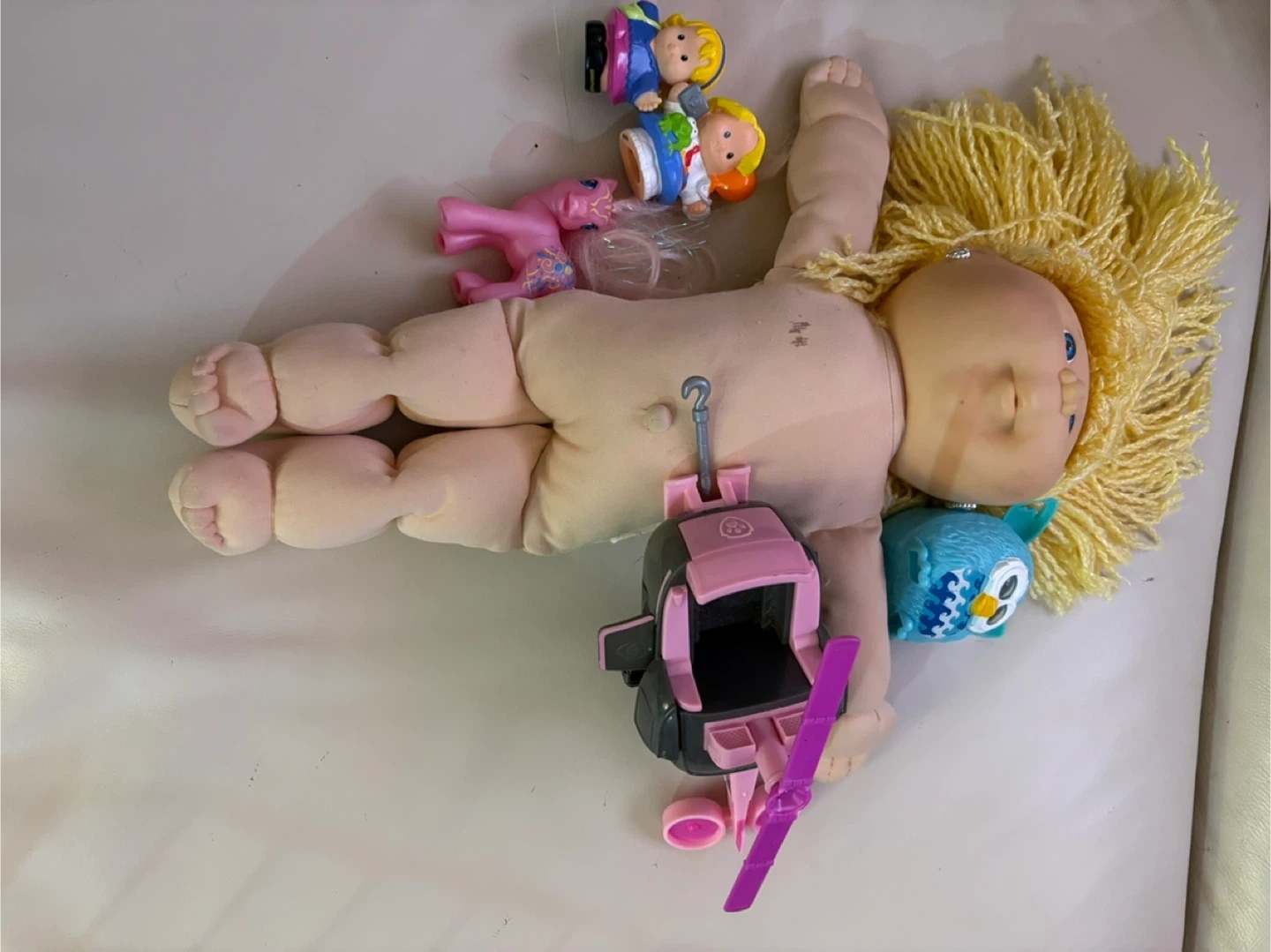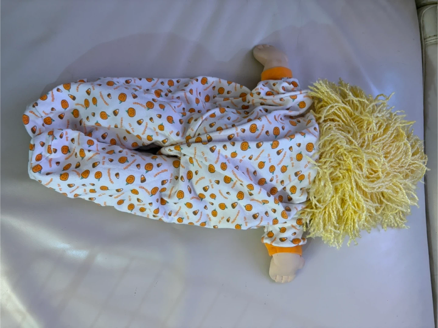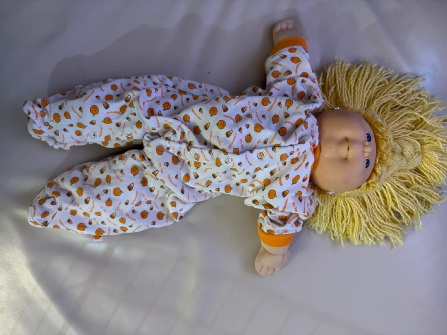 Selling a cute Cabbage Patch Kids doll only with blonde hair and blue eyes! It's wearing a cute onesie with a candy corn pattern. Perfect for collectors or as a cuddly friend for a child