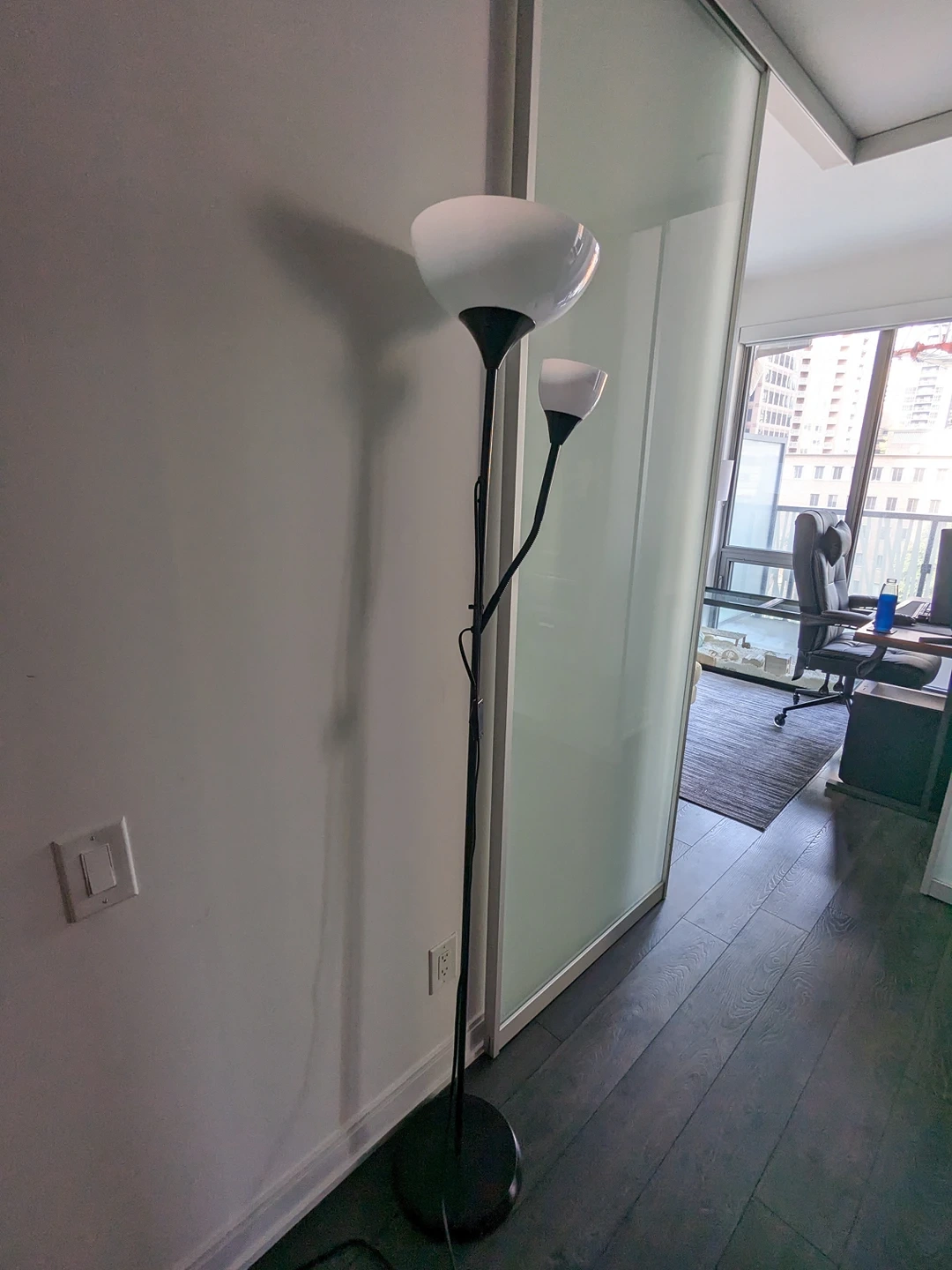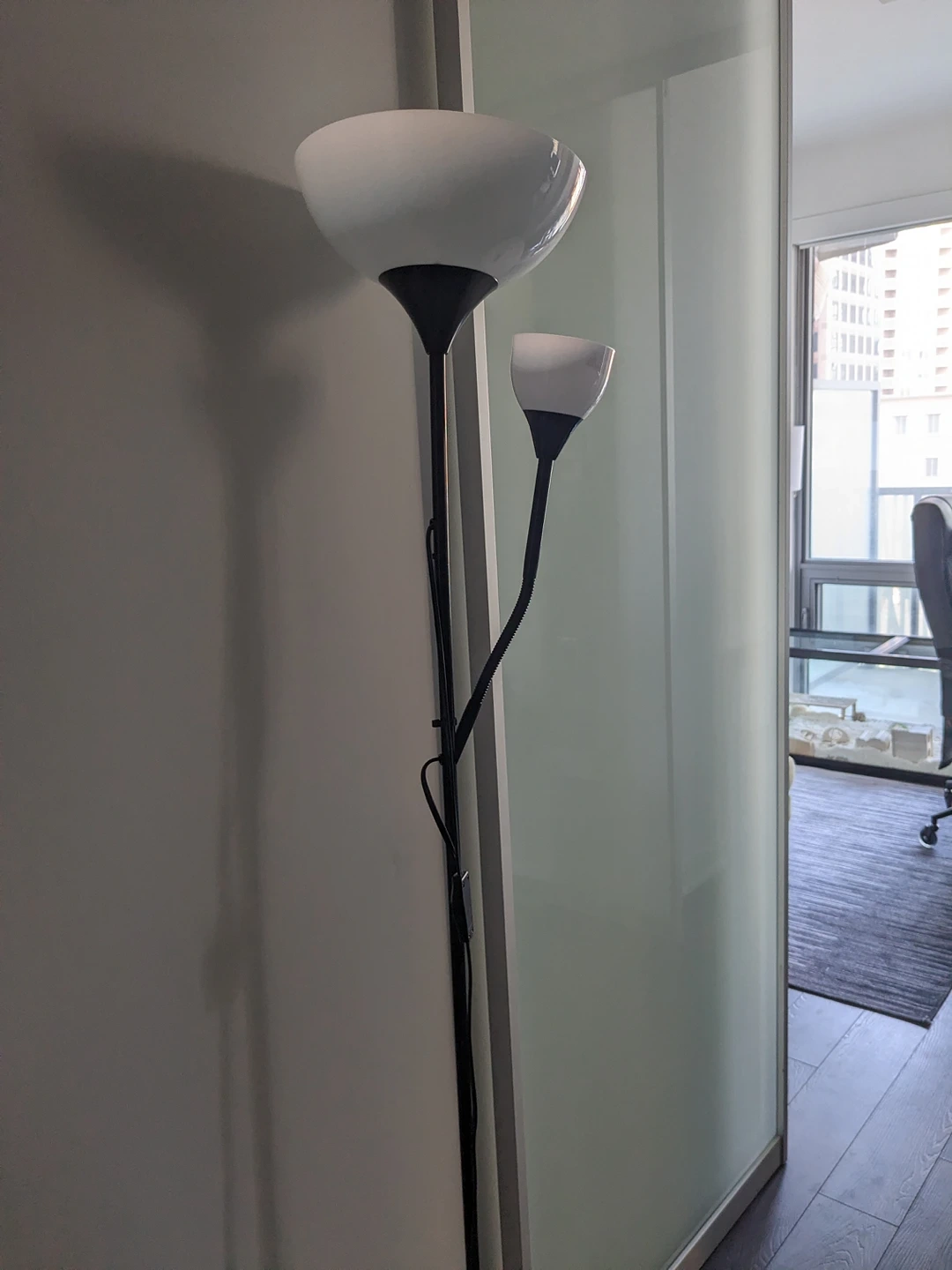 Perfect lamp for a small studio. One lamp lights up the room and the other is flexible and can be redirected to your desk.