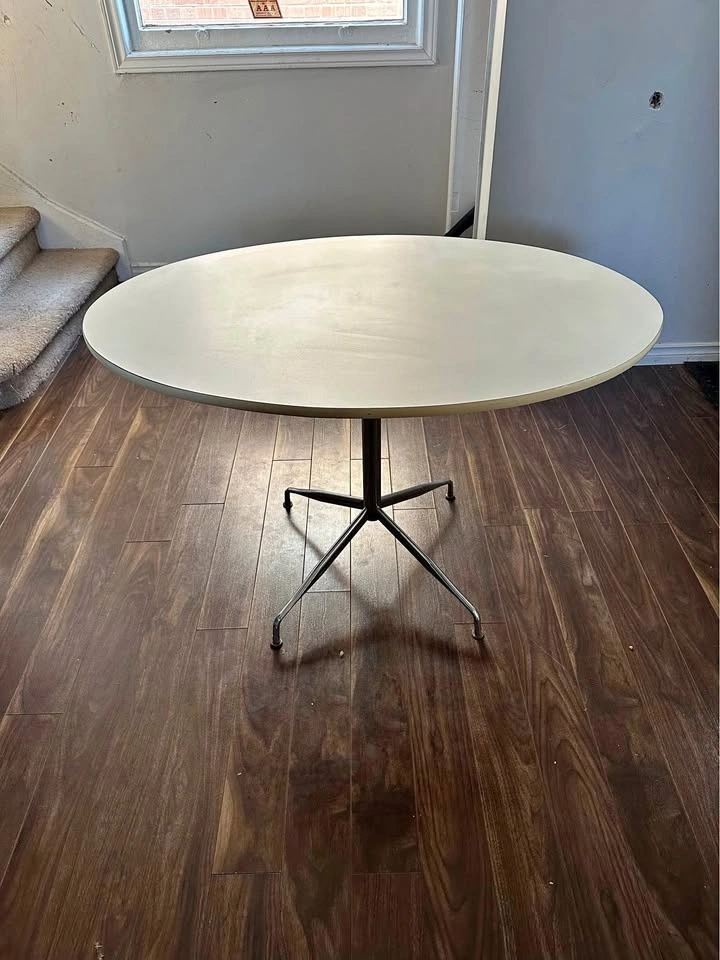 Beautiful vintage round pedestal table with a Mid-Century Modern chrome star-base. The top is a clean matte white laminate with a slim edge profile, giving it a timeless, Scandinavian-inspired look. The chrome base has authentic patina from age, adding character without affecting stability.