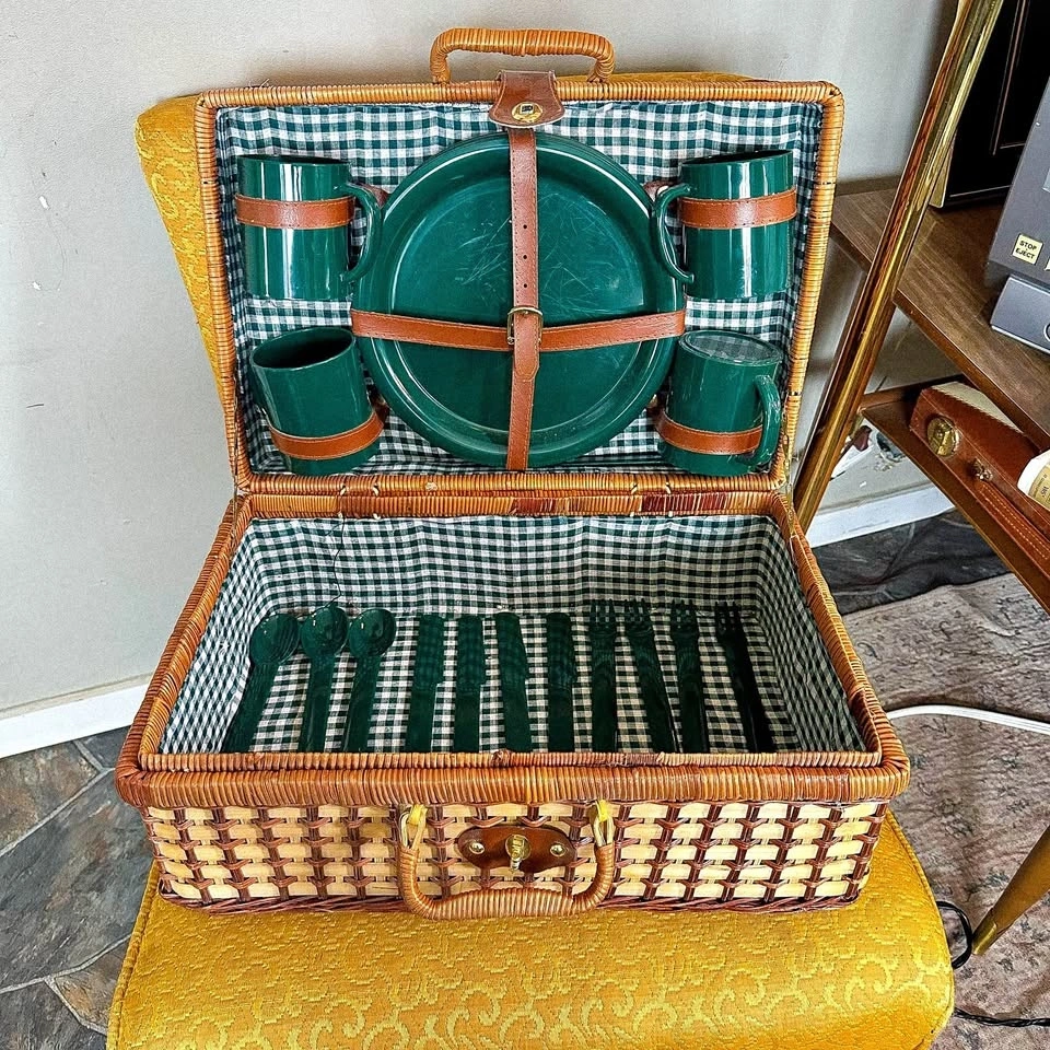 Super cute retro picnic basket with matching green dish set. Includes plates, cups, and utensils secured in place with straps. Great for decor or actual picnics!