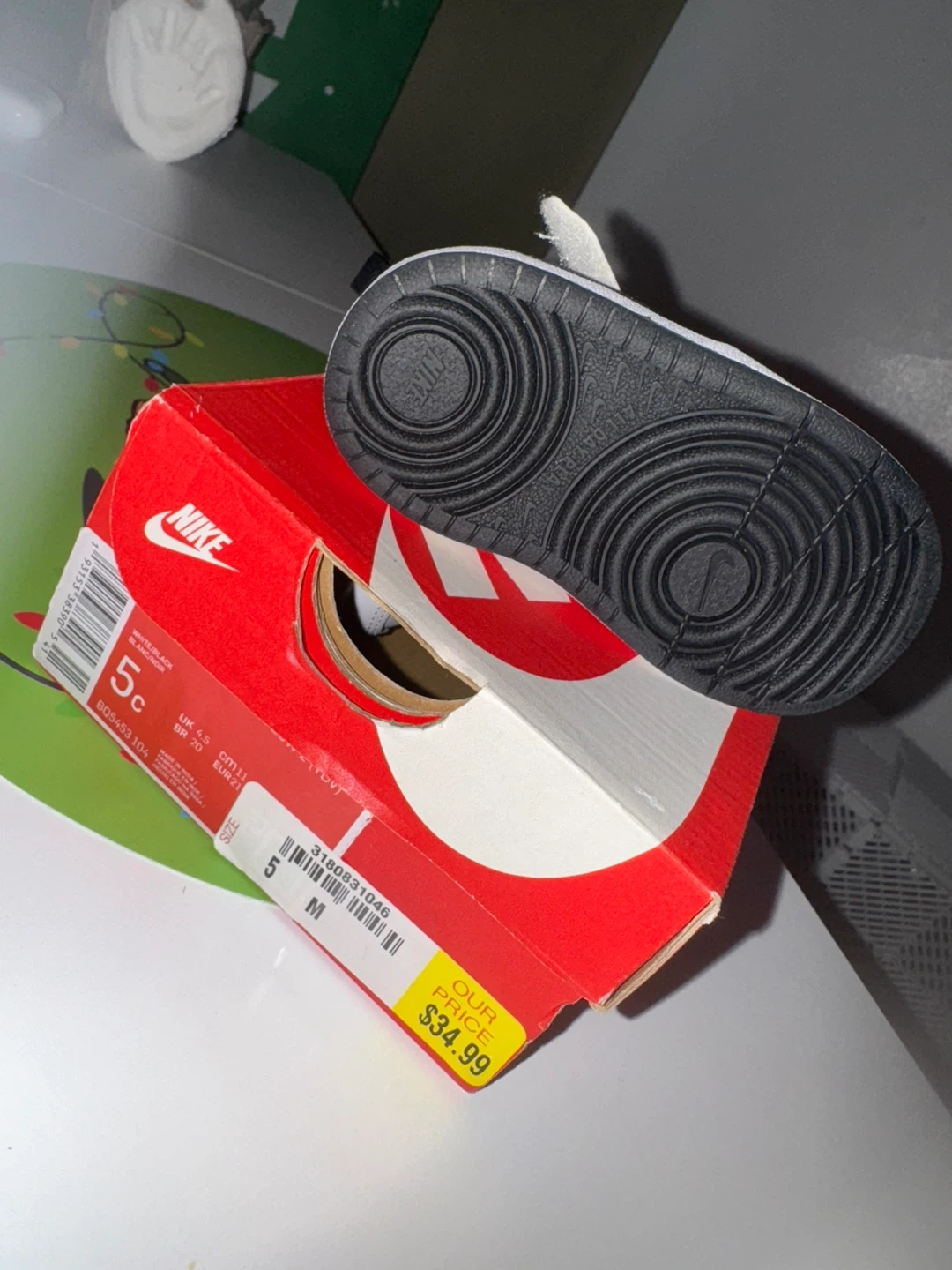 I'm selling a pair of Nike Court Borough Low 2 toddler shoes in size 5C. They are white with black accents and come with the original box. The box shows an original price of $34.99.