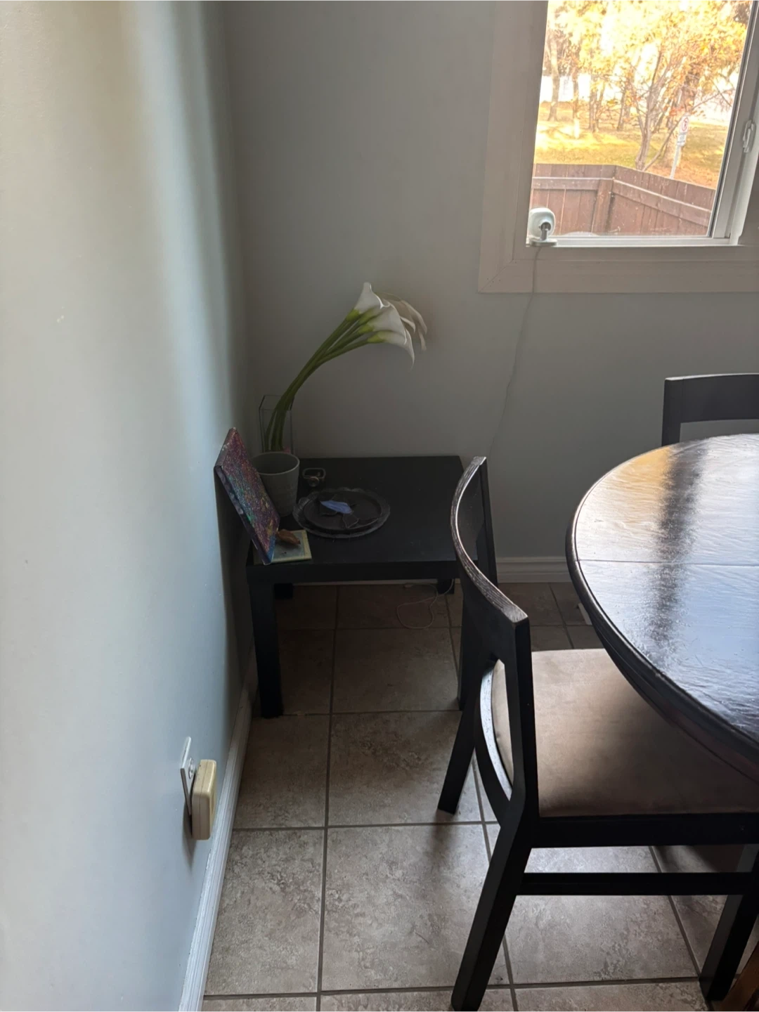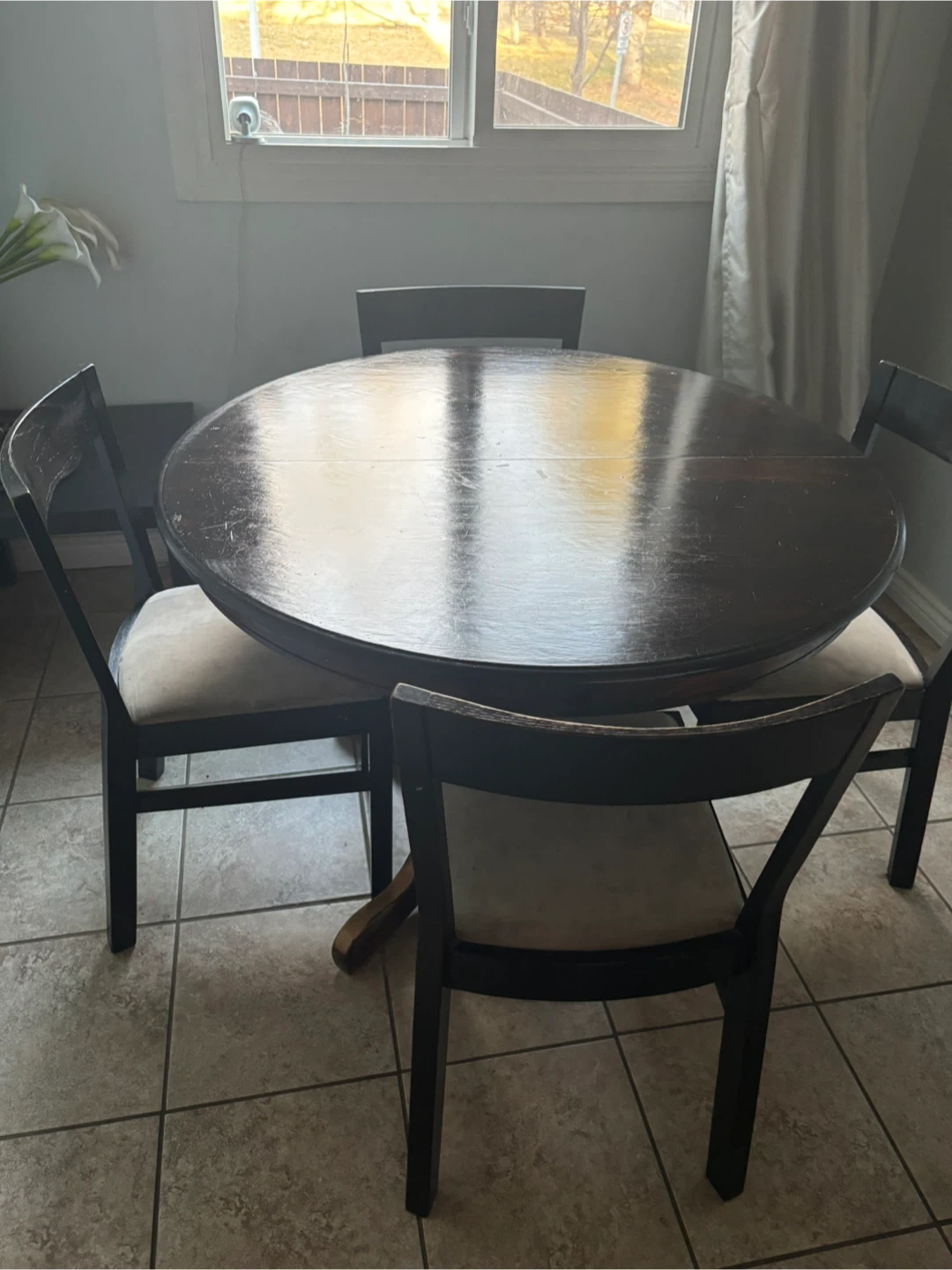Selling a dark brown dining table that comes with four matching chairs. It's a great set for a kitchen or dining area. The table has a classic design and the chairs are comfortable. Perfect for family meals or gatherings!