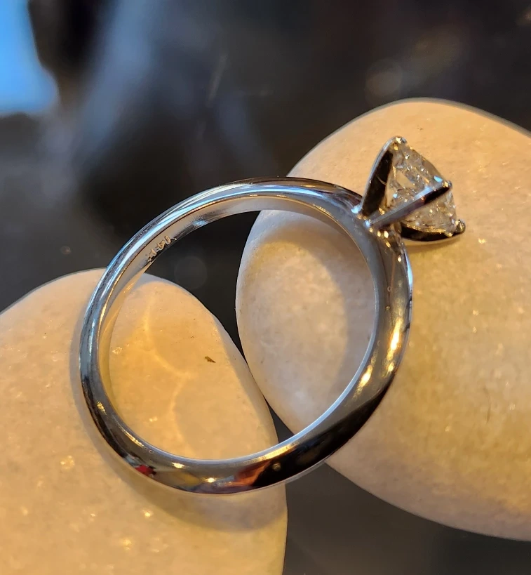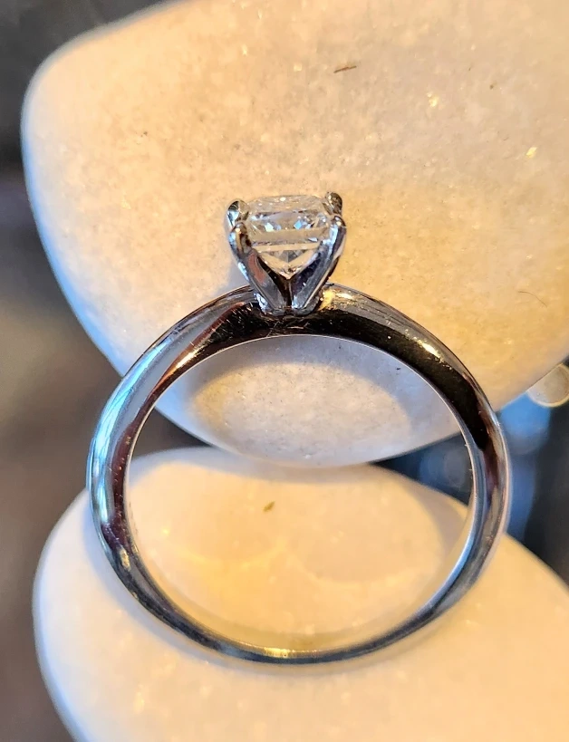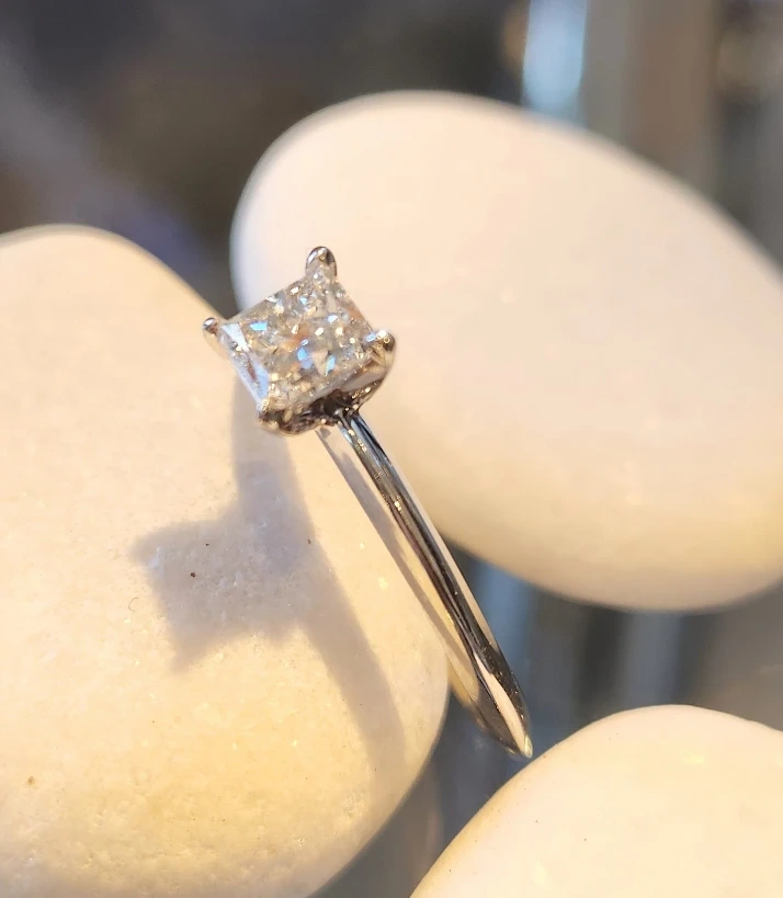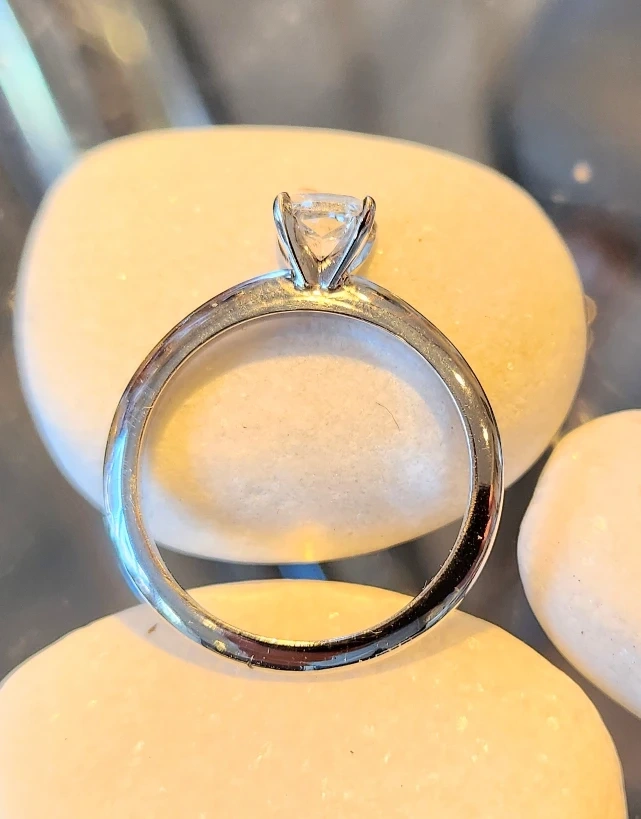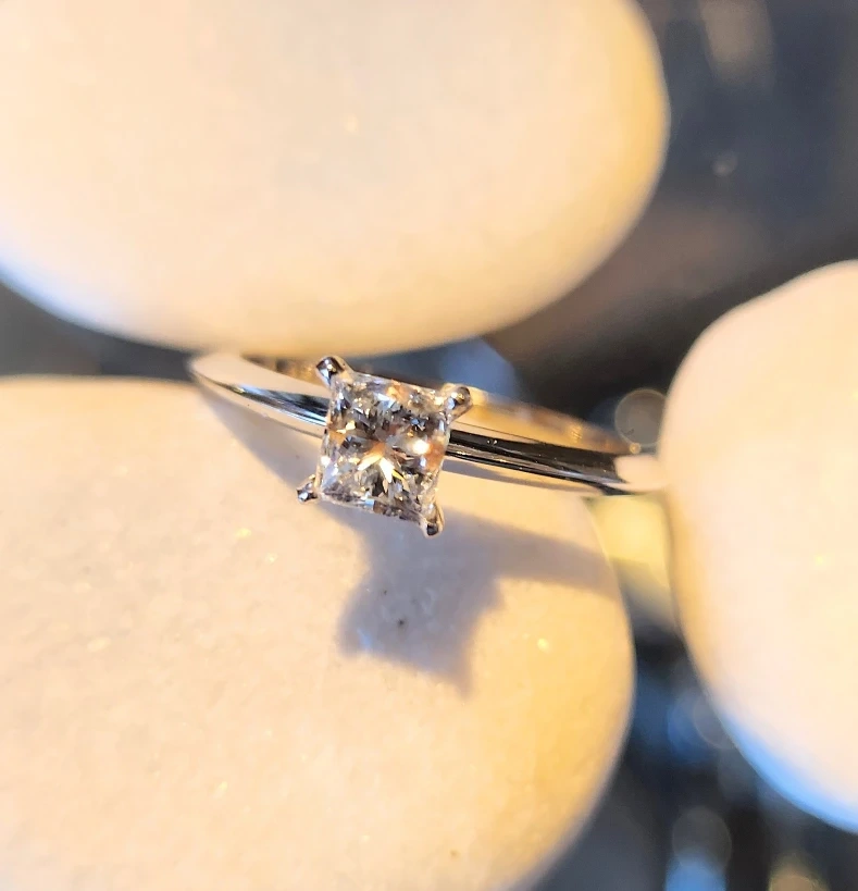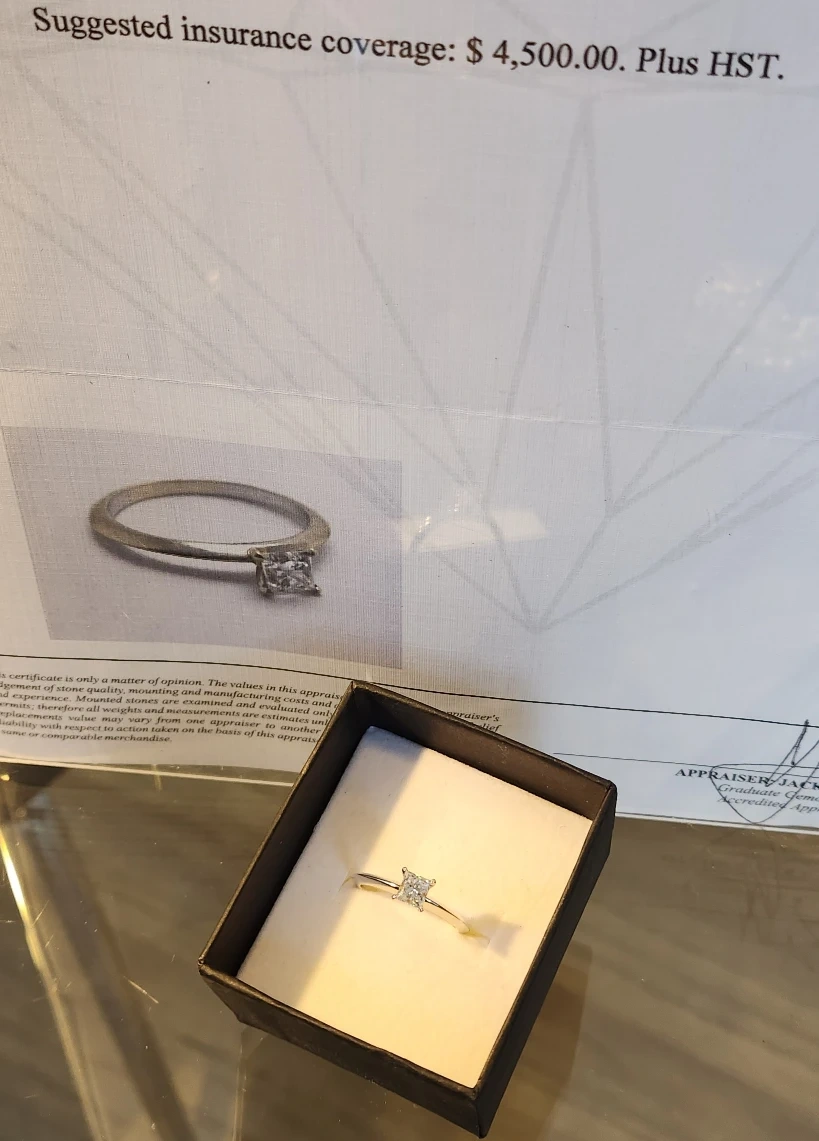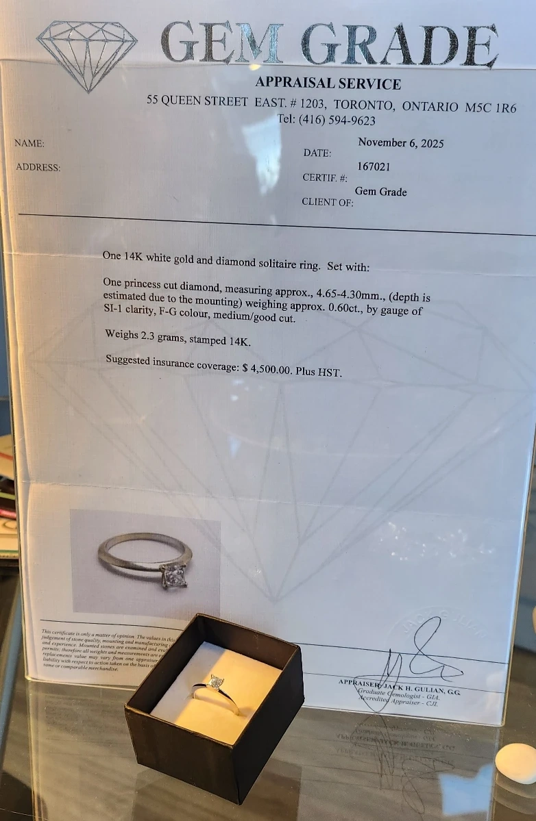 Selling a beautiful 14K white gold and diamond solitaire ring. The princess cut diamond measures approximately 4.65-4.30mm, with a depth estimated due to the mounting. It weighs approximately 0.60ct., by gauge of SI-1 clarity, F-G colour, medium/good cut. The ring itself weighs 2.3 grams and is stamped 14K. The suggested insurance coverage is $4,500.00 plus HST.