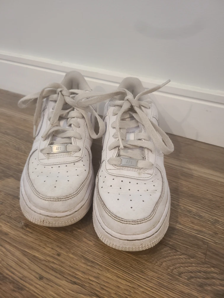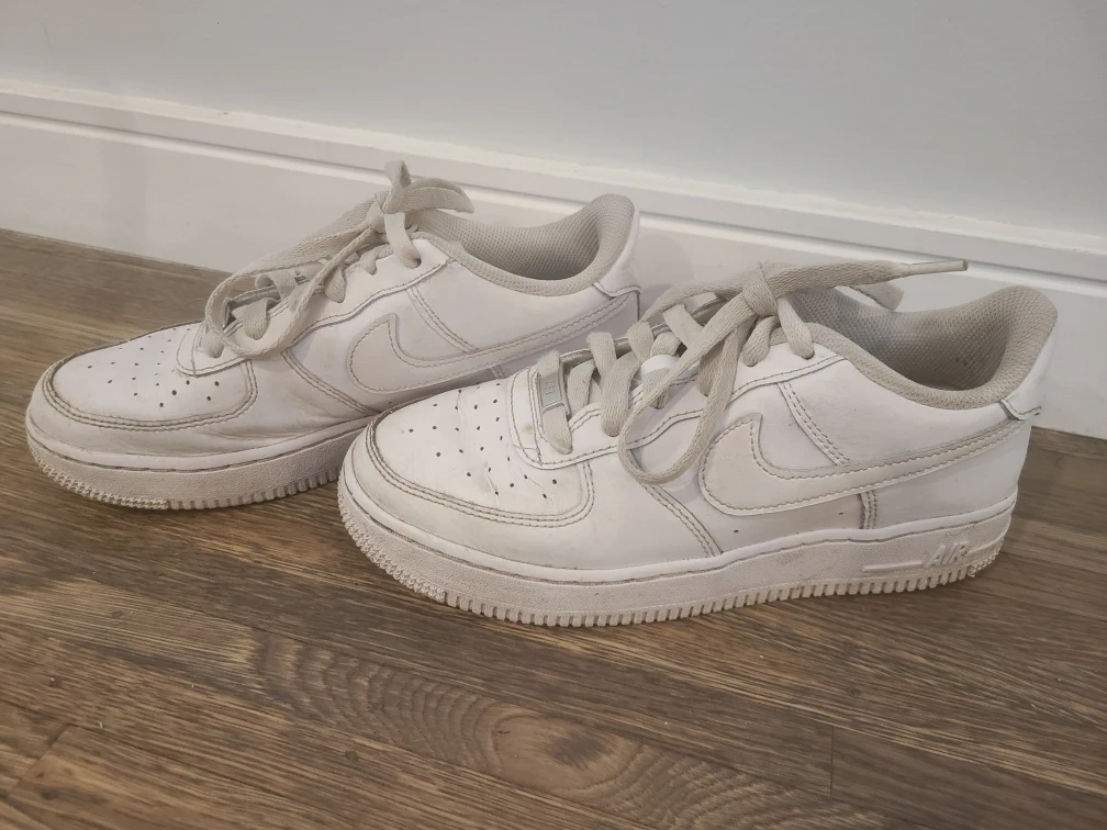 Selling a pair of Nike Air Force 1 sneakers in white. They are size 5 (US). They show some signs of wear, but still have lots of life left in them!