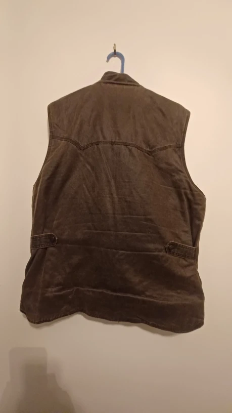 Here's a Vintage Outback Oilskin Vest Weatherproof & Broken-In! It's a size Large and has a unique, rugged look. Perfect for adding a bit of western flair to your wardrobe.