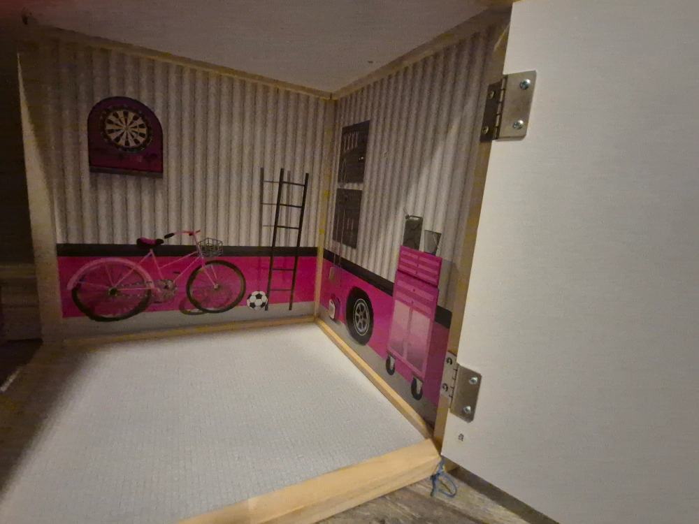 Selling a dollhouse that comes with a garage! It's in great shape and ready for a new home. The dollhouse is decorated with fun details like a pink bicycle, dart board, and a pink tool box in the garage. Inside the dollhouse, there is a living room, kitchen, and other rooms to explore!